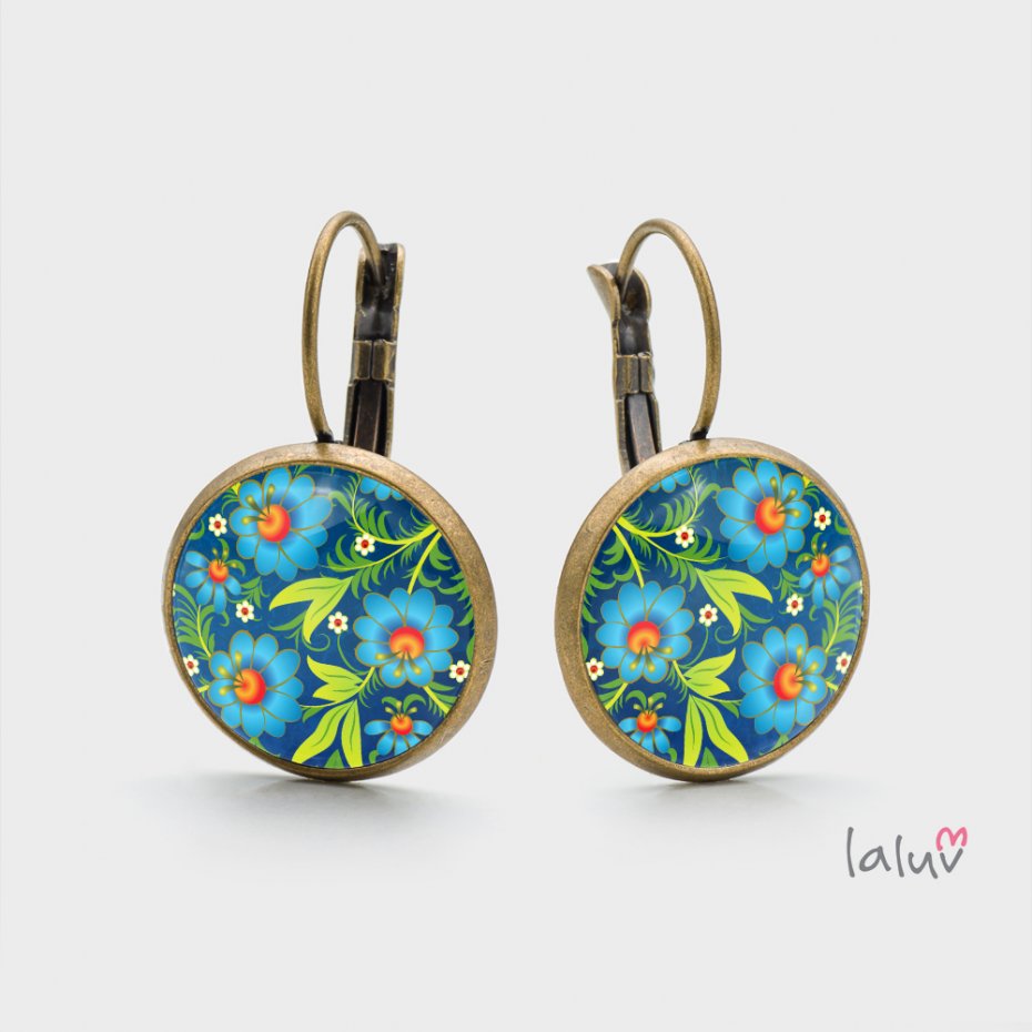 Ręcznie robione kolczyki z wysokiej jakości grafiką zamkniętą pod wypukłym szkiełkiem i oprawioną w antyalergiczną bazę w kolorze starego złota.
