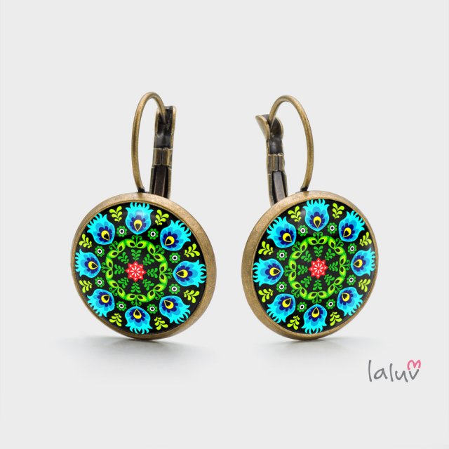 Ręcznie robione kolczyki z wysokiej jakości grafiką zamkniętą pod wypukłym szkiełkiem i oprawioną w antyalergiczną bazę w kolorze starego złota.