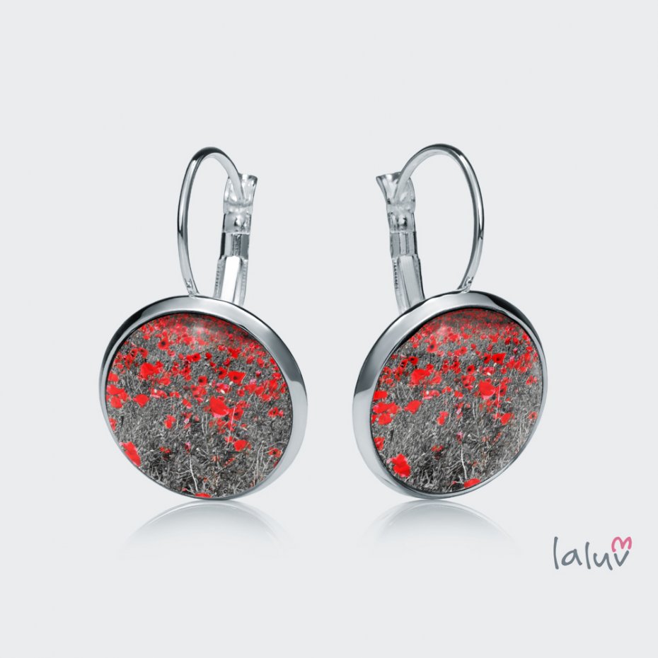Ręcznie robione kolczyki z wysokiej jakości grafiką zamkniętą pod wypukłym szkiełkiem i oprawioną w antyalergiczną bazę w kolorze srebrnym.