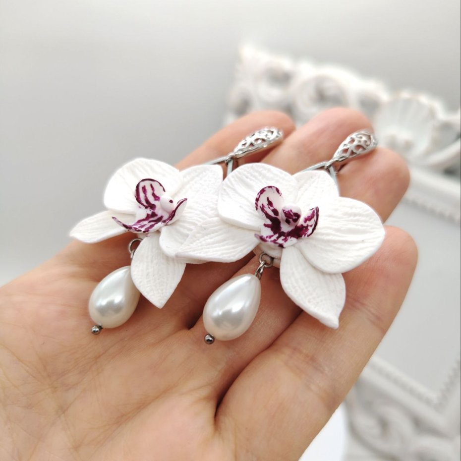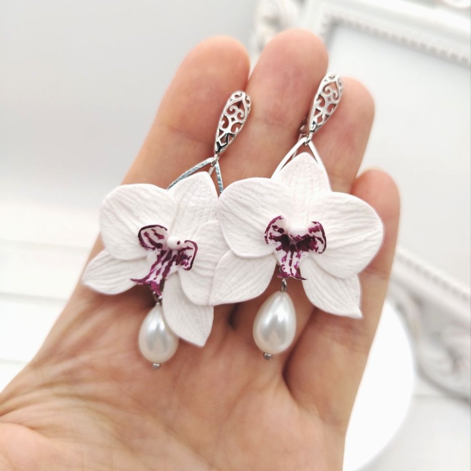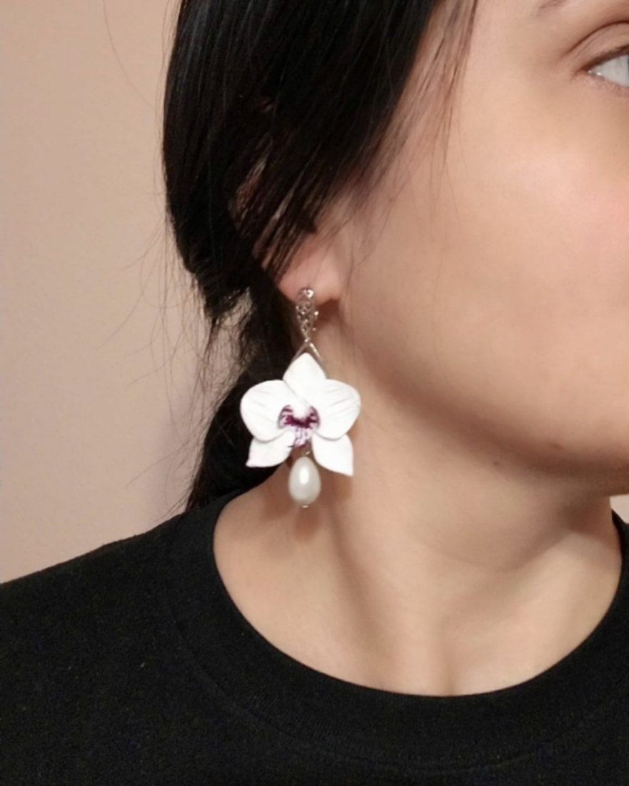 Eleganckie kolczyki wiszące z białymi storczykami, uzupełnione sztuczną perłą, która dodaje im klasy i delikatnego, szlachetnego charakteru. Storczyki zostały wykonane i wykończone z dużą dbałością o detale, zachowując naturalny kształt płatków. Kolczyki posiadają wygodne i bezpieczne angielskie zapięcie, idealne do dłuższego noszenia.