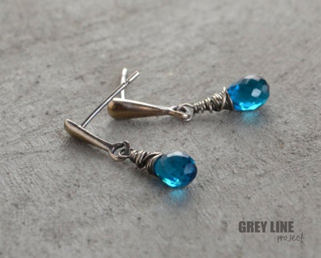 Drobne minimalistyczne kolczyki na wkrętkach wykonane ze srebra próby 925, oksydowanego i przecieranego oraz pojedynczej łezki intensywnie niebieskiego kwarcu teal blue.
