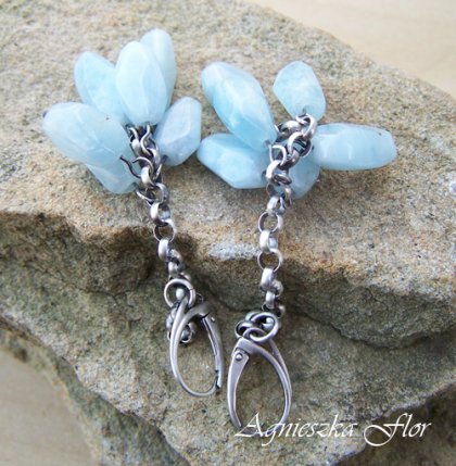 Kolczyki wykonane ze srebra pr.925. Długie, wiszące grona. Fasetowane bryły akwamarynów ( ok 14mm 8mm ). Oksydowane i polerowane.