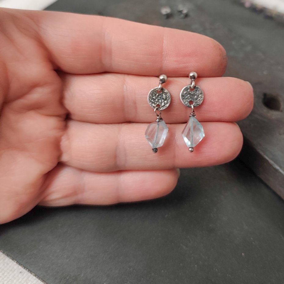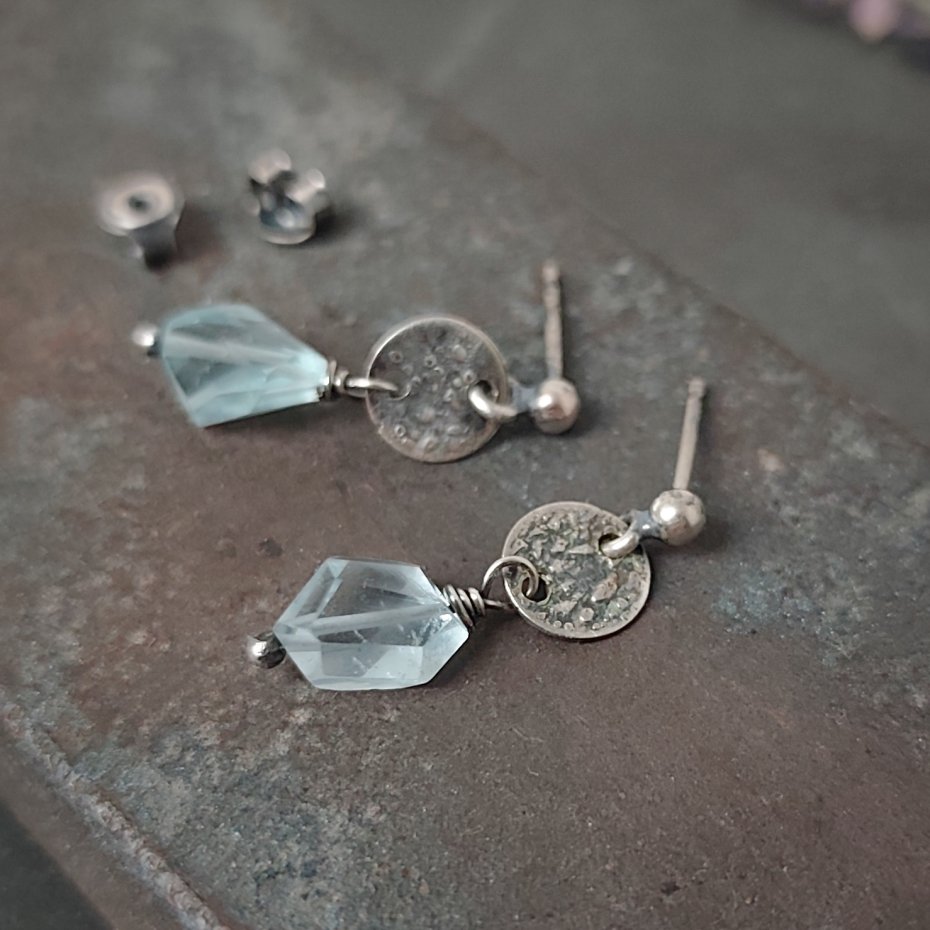 Kolczyki zostały wykonane ze srebra próby 925 oraz z nieregularnych bryłek naturalnego akwamarynu.