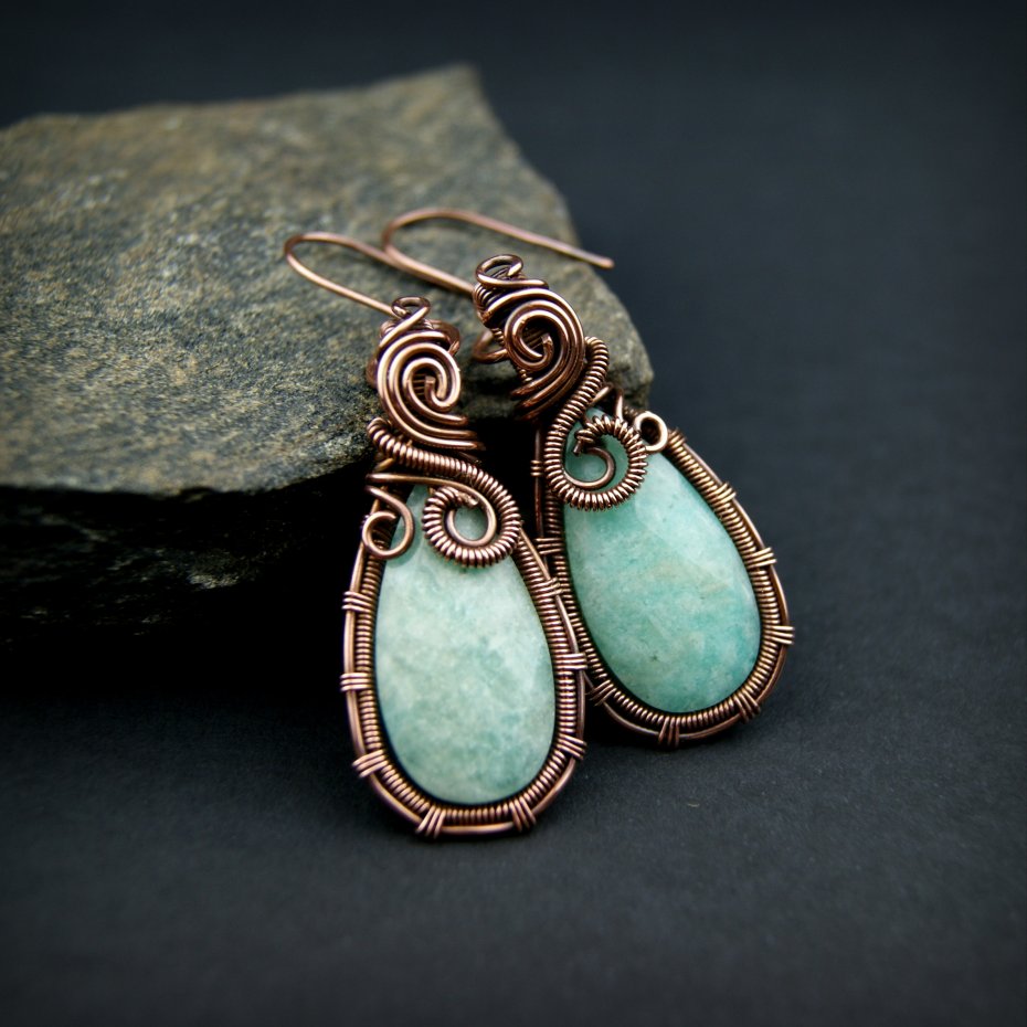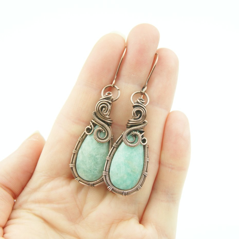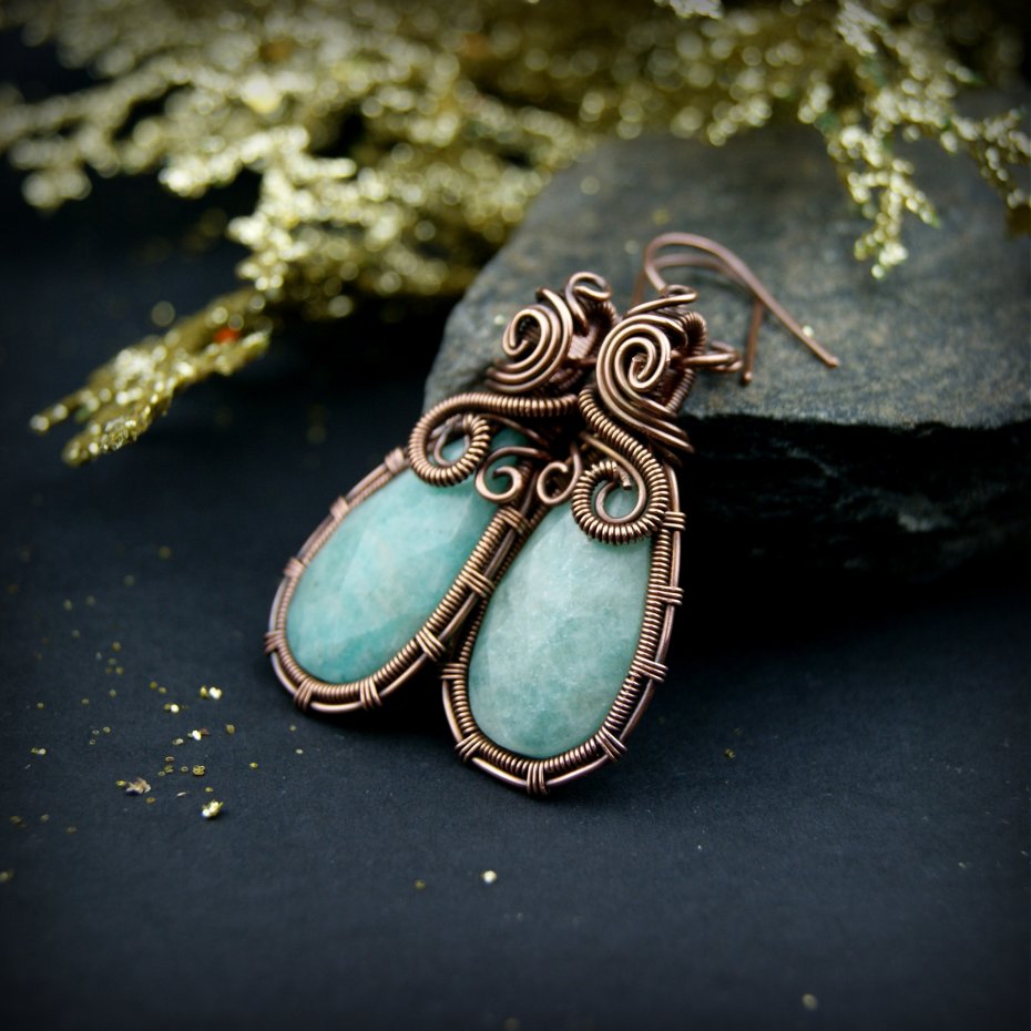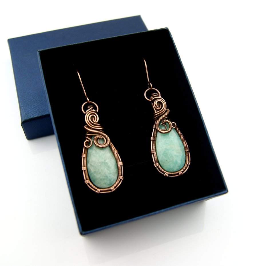 Wiszące kolczyki wykonane z miedzi oraz kamieni naturalnych. Do stworzenia kolczyków użyto kamieni amazonitu o kształcie fasetowanej łezki oraz drutu miedzianego, całość oksydowano.