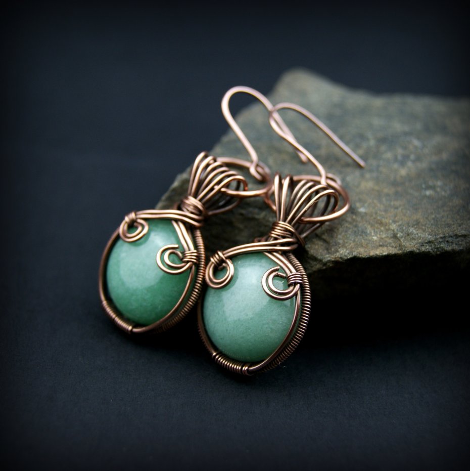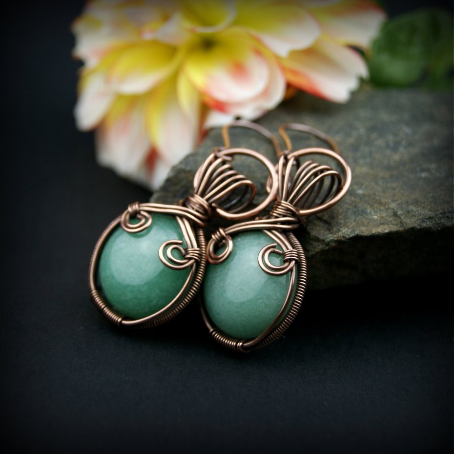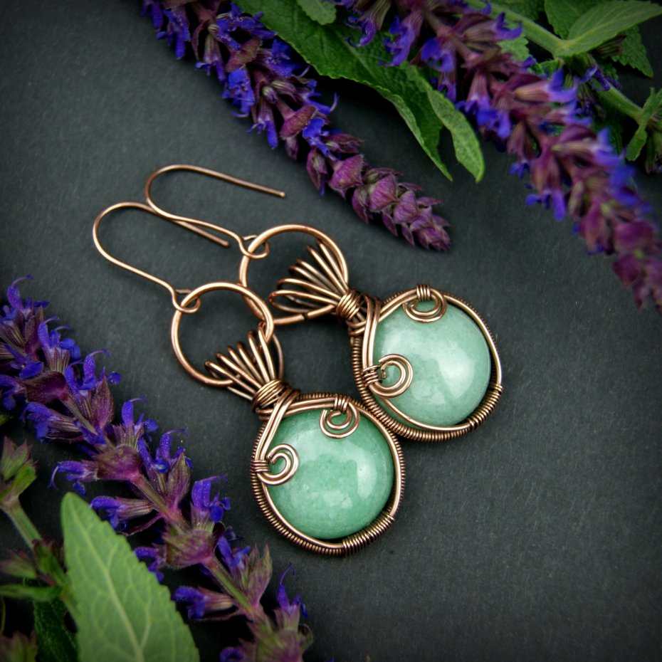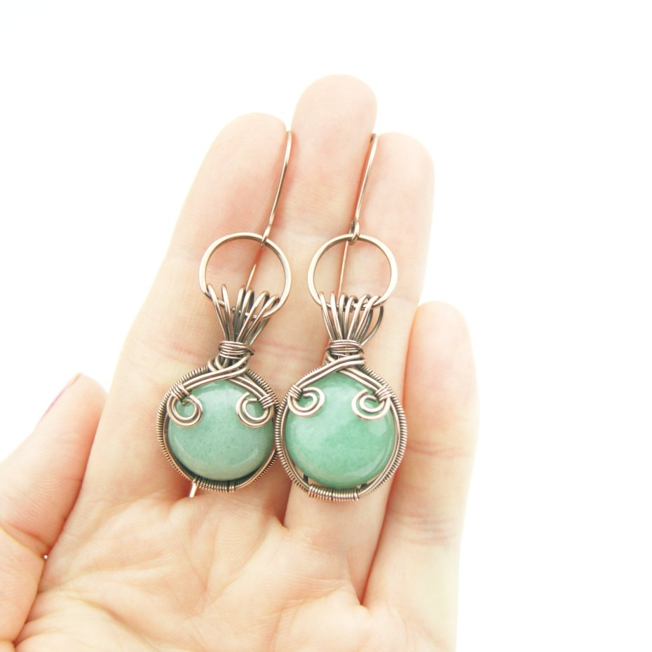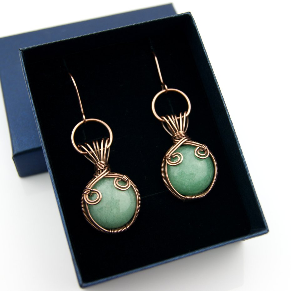 Wiszące kolczyki wykonane z miedzi oraz kamieni naturalnych. Do stworzenia kolczyków użyto kamieni awenturynu oraz drutu miedzianego, całość oksydowano.