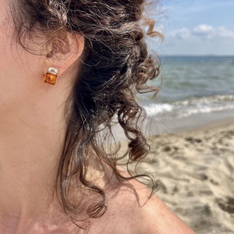 Eleganckie kolczyki z koniakowym bursztynem bałtyckim, szlifowanym topazem i pozłacanym srebrem. Wyjątkowe połączenie bursztynu z pięknym, błękitnym minerałem.