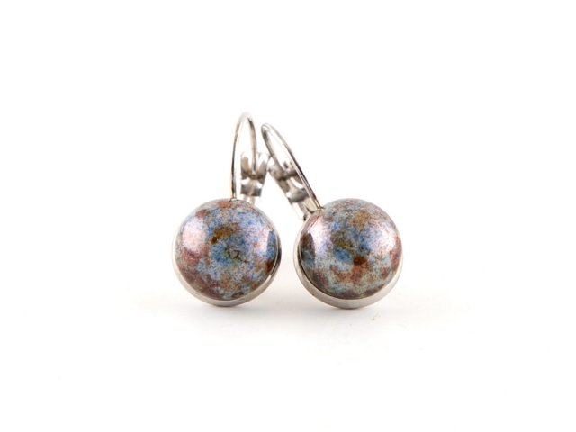Subtelne, niewielkie kolczyki w oprawie w kolorze srebrnym. Ceramiczne oczka są w kolorach zgaszonego błękitu, szarości i brązów.