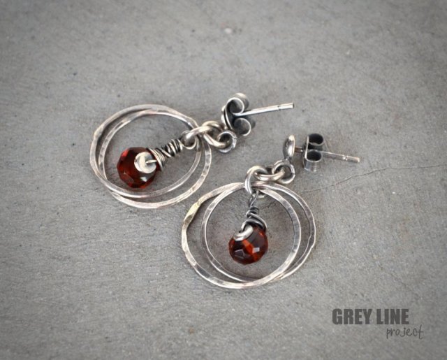 Kolczyki na wkrętkach w formie dwóch wzajemnie przeplatających się srebrnych kół średnicy 1,5cm oraz pojedynczej fasetowanej oponki unikatowego cytrynu brandy o głębokiej bursztynowej barwie. Całość oksydowana i przecierana.