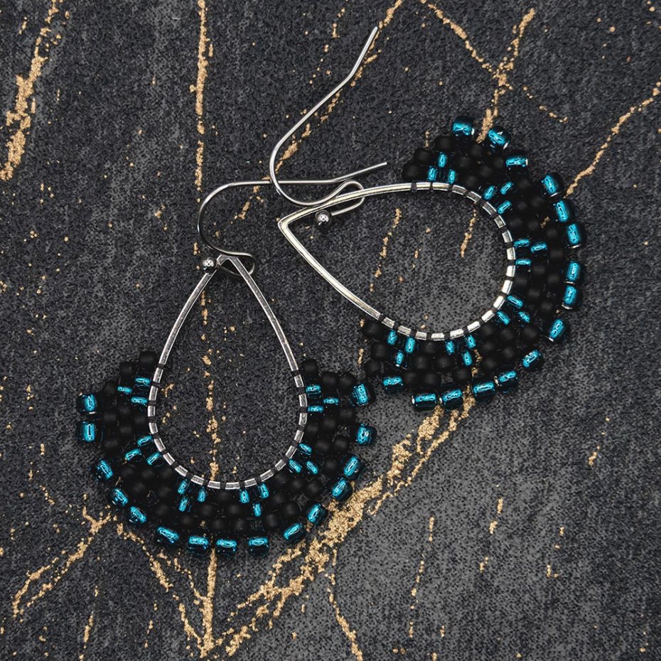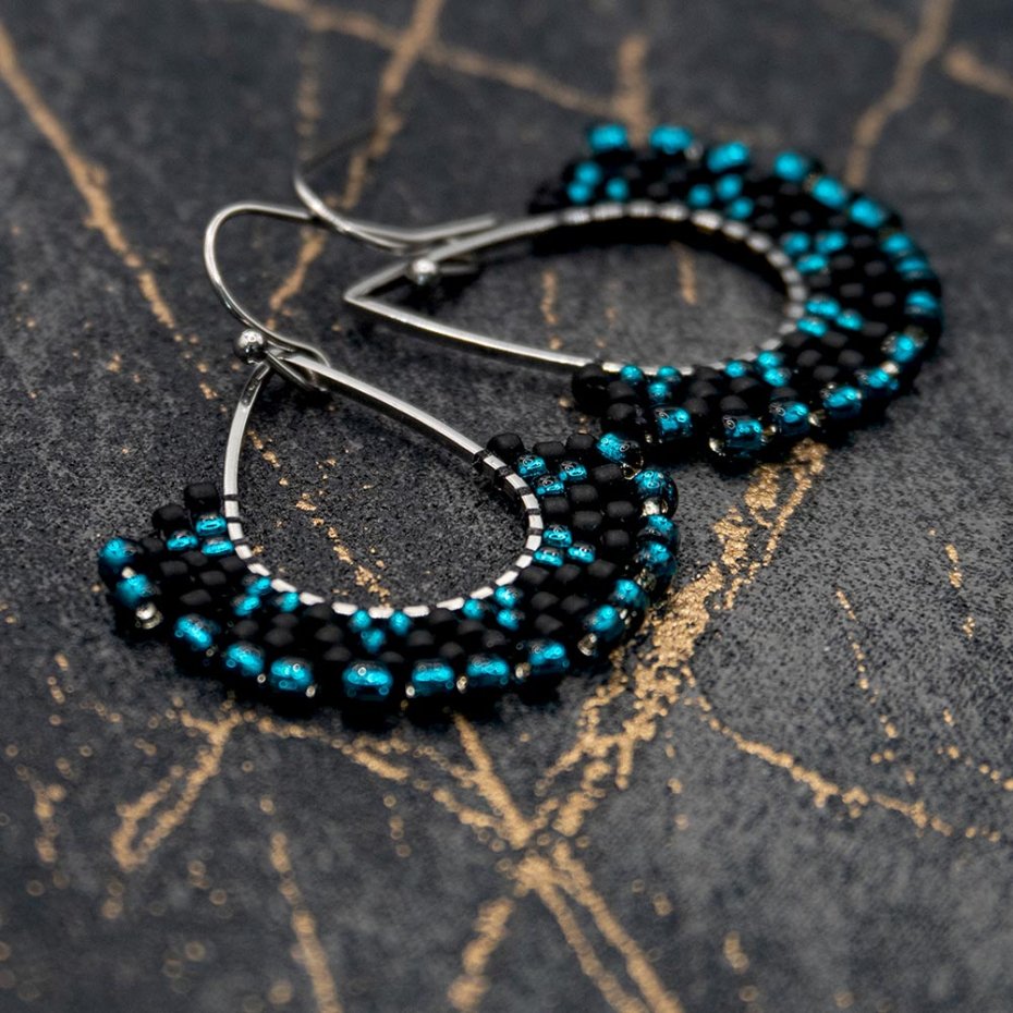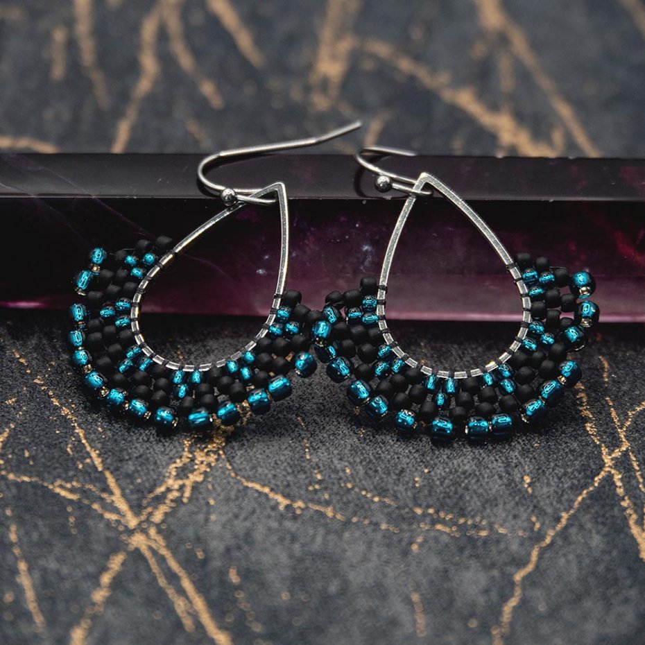 Wiszące kolczyki z drobnymi koralikami i elementami w kolorze srebrnym.