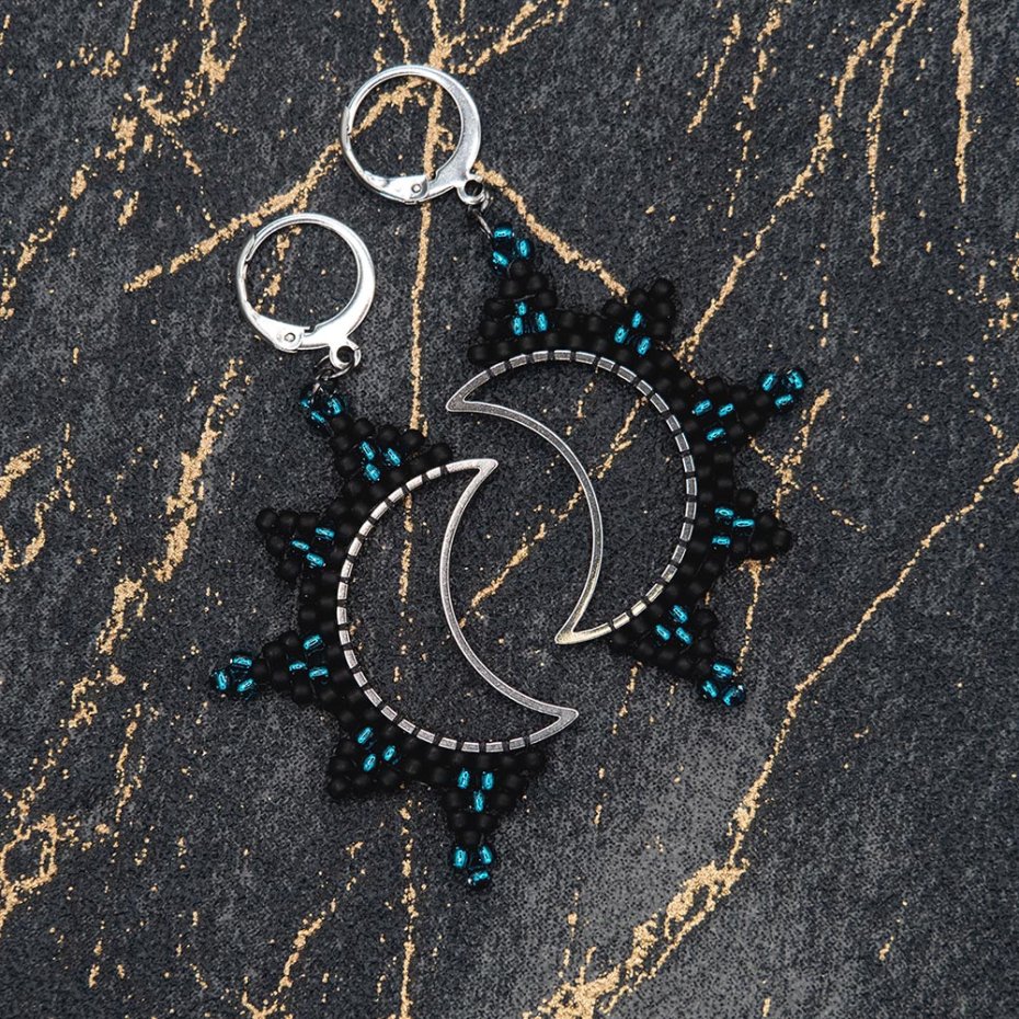 Wiszące kolczyki z drobnymi koralikami i elementami w kolorze srebrnym.