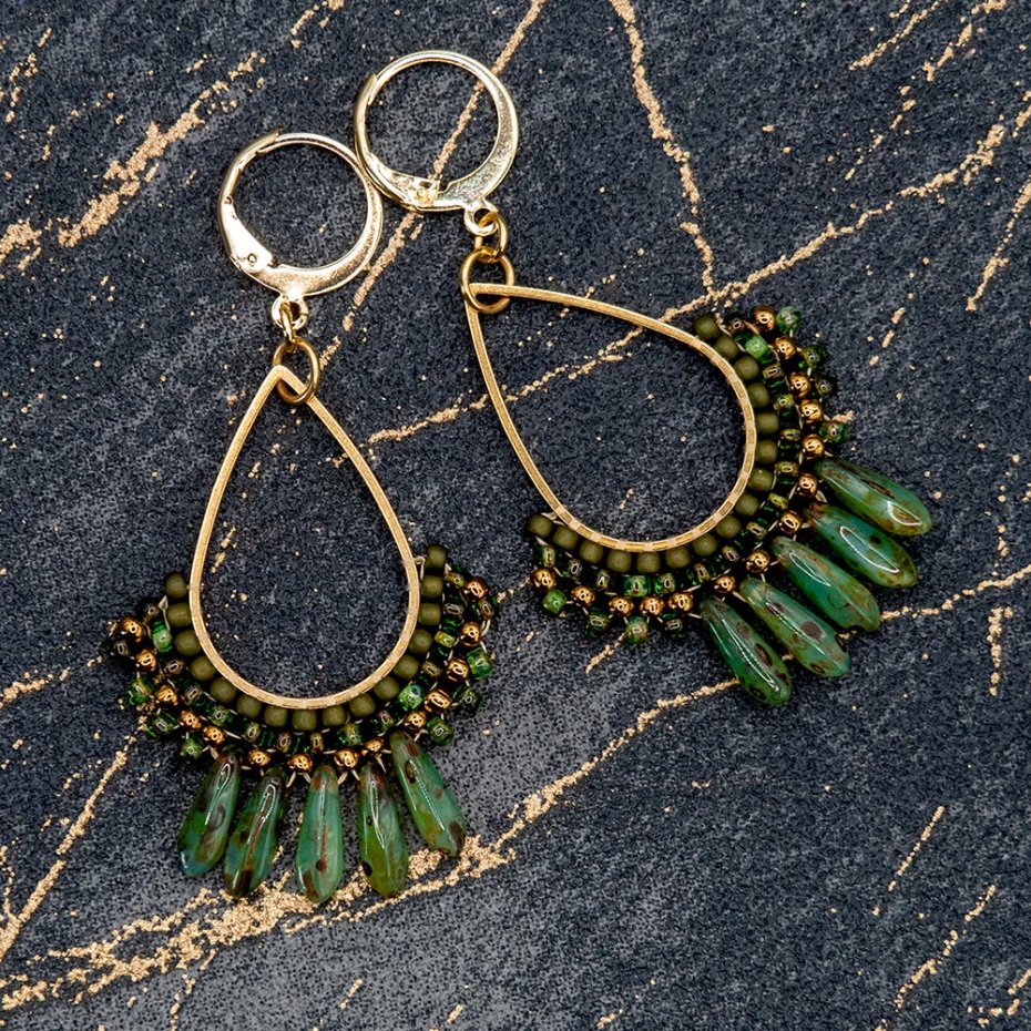 Wiszące kolczyki z drobnymi koralikami i elementami w kolorze złotym.