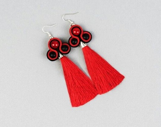 Kolczyki wykonane techniką soutache, przyozdobione niezwykle efektownymi frędzlami, podszyte miękkim filcem.