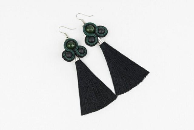 Kolczyki wykonane techniką soutache, przyozdobione niezwykle efektownymi frędzlami, podszyte miękkim filcem.