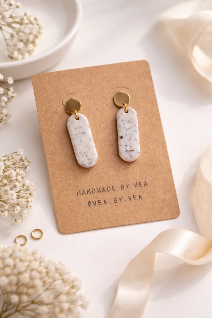 Wykonane ręcznie z glinki polimerowej w jasnym, kremowym odcieniu z delikatnymi drobinkami, które nadają im naturalny, kamienny charakter.