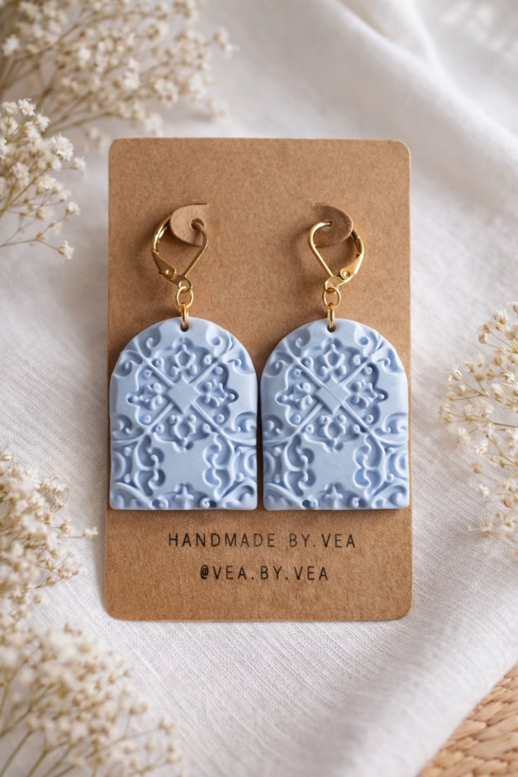 Błękitne kolczyki z glinki polimerowej z subtelnym, ornamentalnym wzorem to idealne połączenie delikatności i elegancji. Ręcznie wykonane, lekkie i wygodne w noszeniu, pięknie dopełnią każdą stylizację.