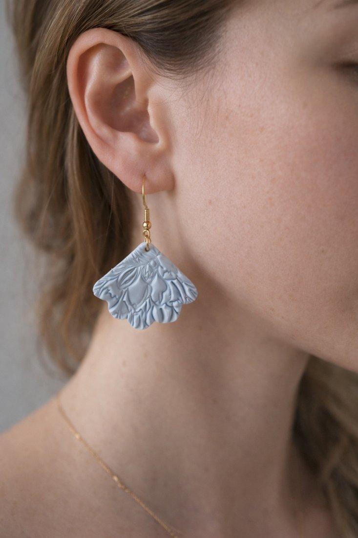 Kolczyki zawieszone są na minimalistycznych, złotych sztyftach ze stali chirurgicznej, które pięknie kontrastują z chłodnym odcieniem glinki. Są lekkie i komfortowe w noszeniu, idealne zarówno na co dzień, jak i na wyjątkowe okazje – śluby, przyjęcia czy romantyczne spotkania.
