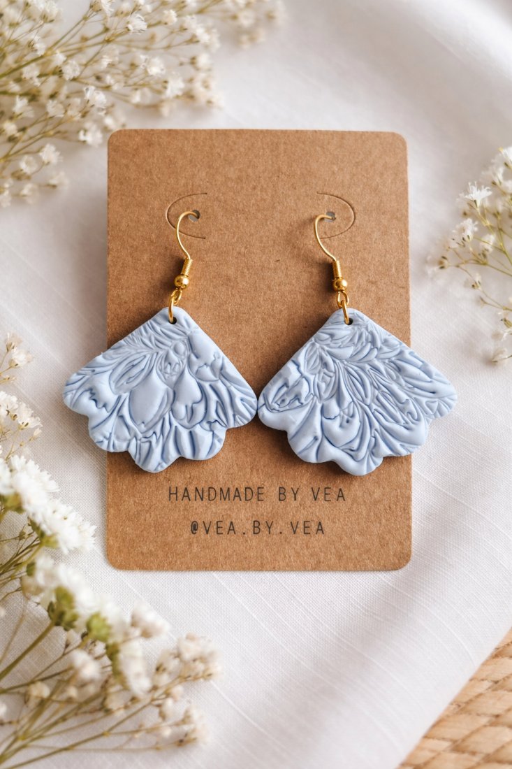 Delikatne, ręcznie wykonane kolczyki o subtelnym, pastelowym charakterze. Wykonane z glinki polimerowej w odcieniu jasnego błękitu z eleganckim marmurkowym wzorem, który sprawia, że każda para jest absolutnie wyjątkowa. Organiczny kształt liścia nadaje im lekkości i naturalnego uroku.