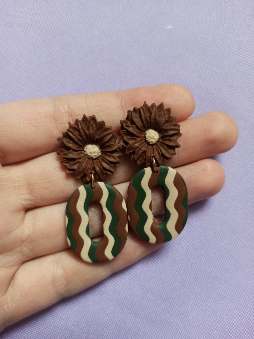 Kolczyki wiszące sztyfty brązowe kwiatki połączone z owalami w fale.