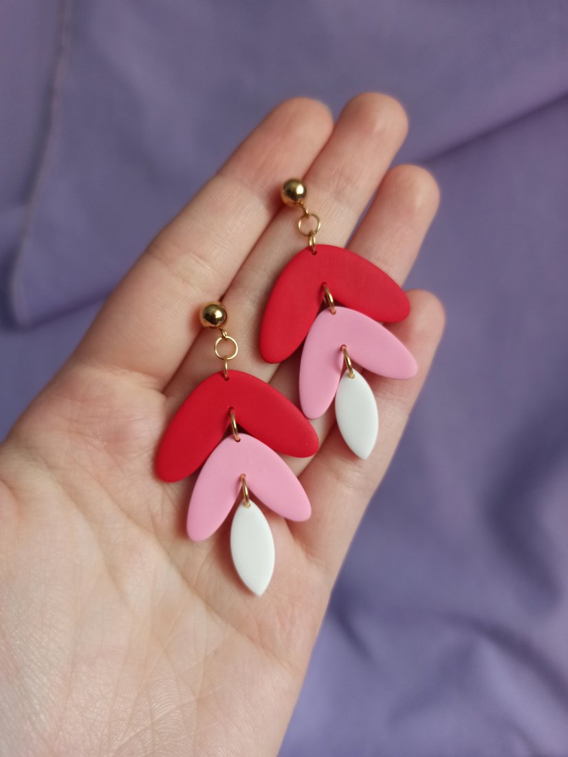 Kolczyki wiszące na ozdobnym sztyfcie kulce w kształcie potrójnych listków. Białe różowe i czerwone