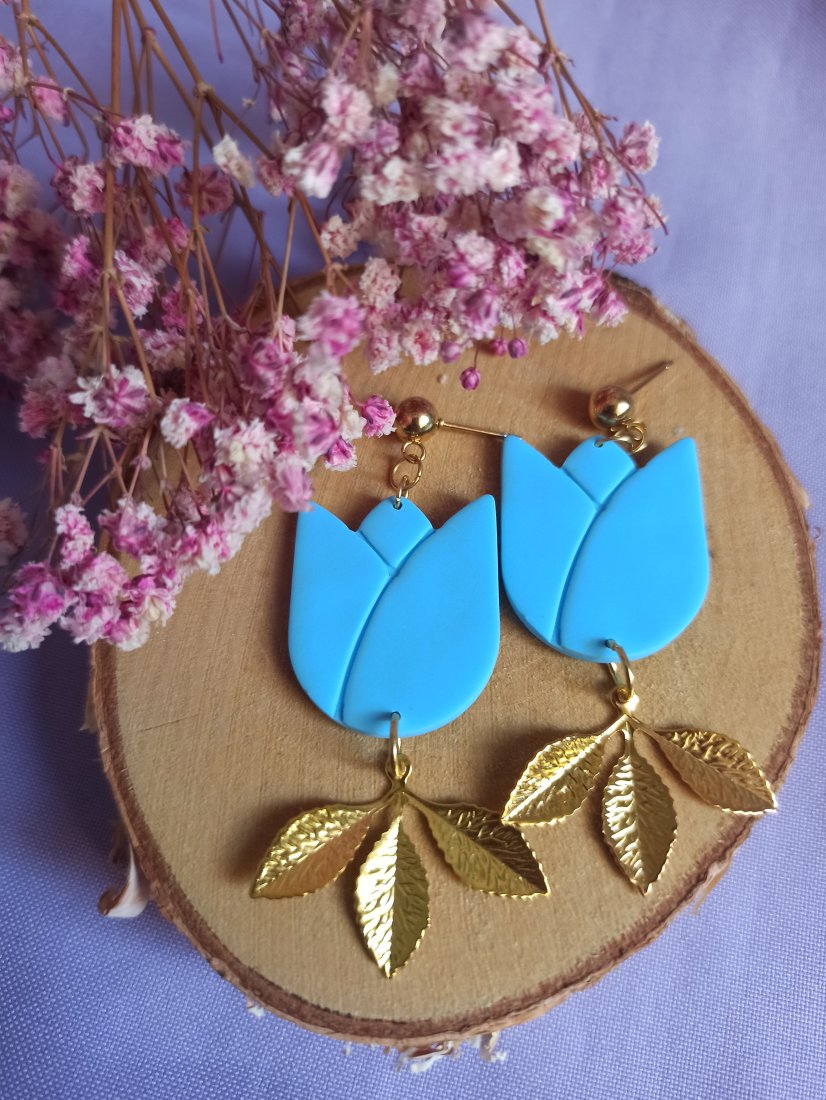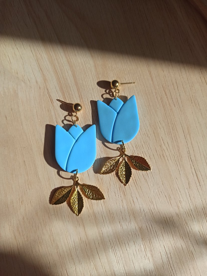 Kolczyki wiszące w kształcie dużych tulipanów w kolorze błękitnym z zawieszką w kształcie złotych listków.