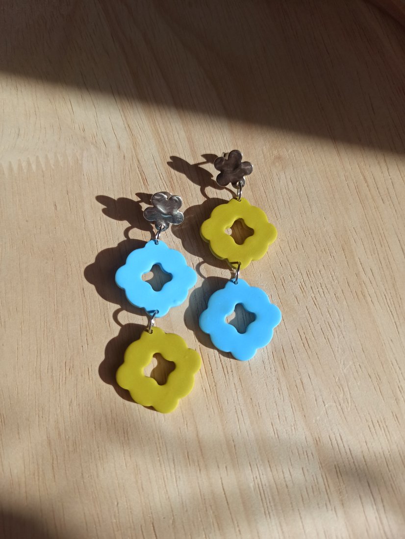 Kolczyki wykonane z gliny polimerowej, lekkie i wytrzymałe. Sztyfty ze stali chirurgicznej. W zestawie zatyczki.