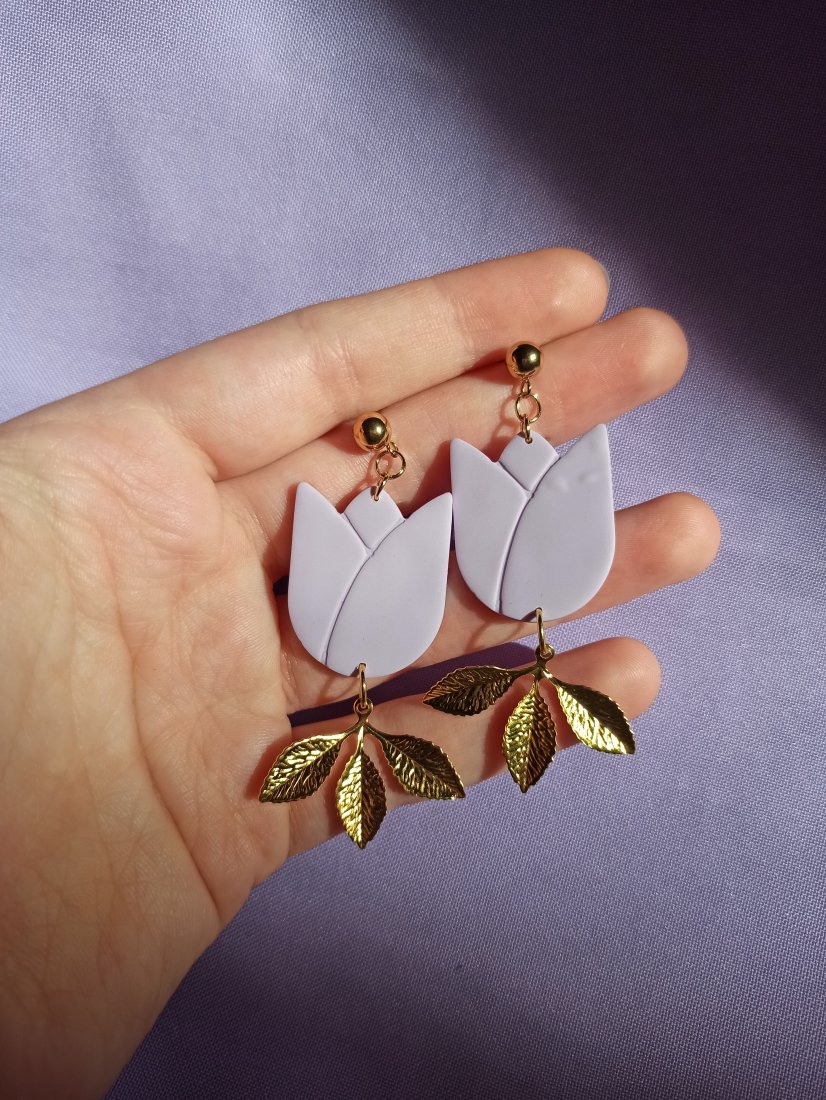 Kolczyki wiszące w kształcie dużych tulipanów w kolorze fioletowym z zawieszką w kształcie złotych listków.
