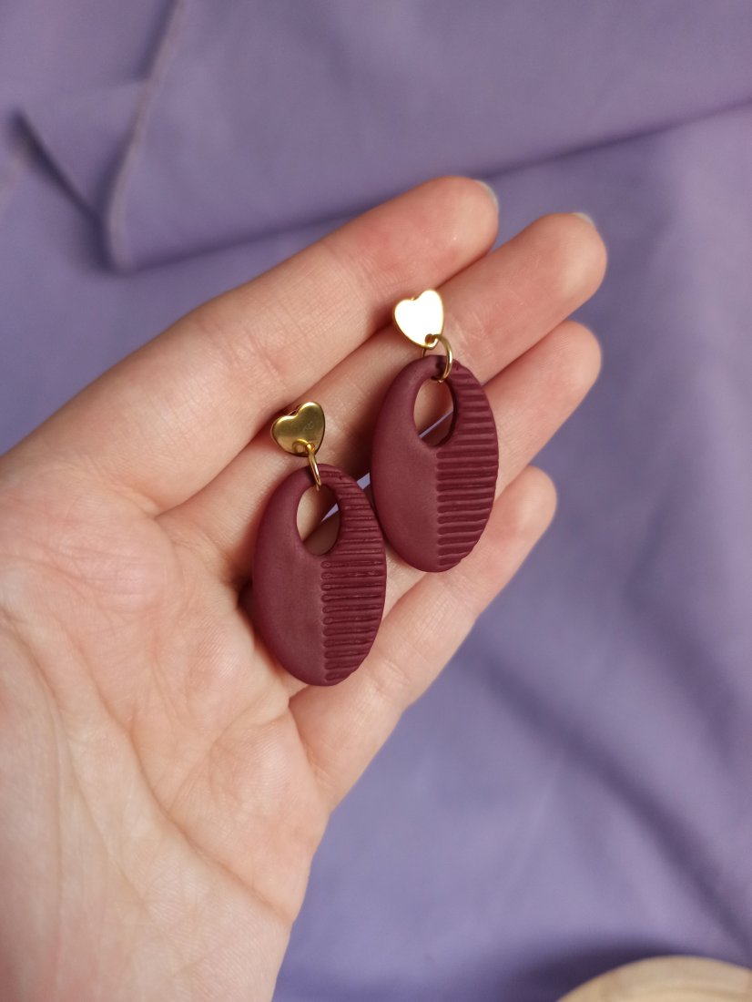 Kolczyki wiszące na ozdobnym sztyfcie serduszku w kształcie owalnym z dwoma strukturami w kolorze bordowym. Połowa owalu jest w wypukłe paski druga zaś gładka.