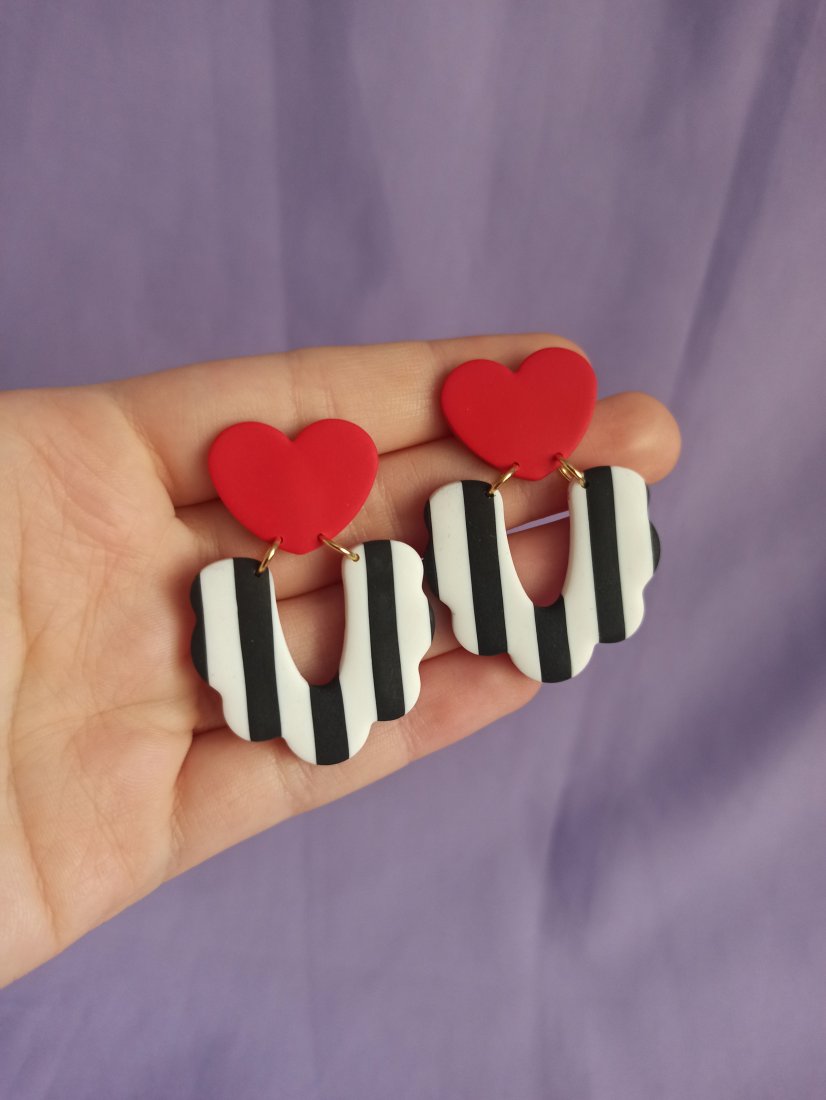 Kolczyki wiszące sztyfty czerwone serca połączone z łukiem w biało-czarne pasy. Tył kolczyka jest czerwony podobnie jak w butach Louboutin.