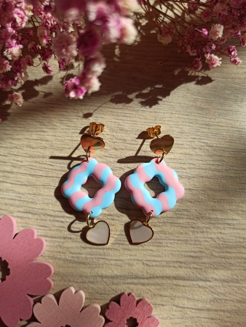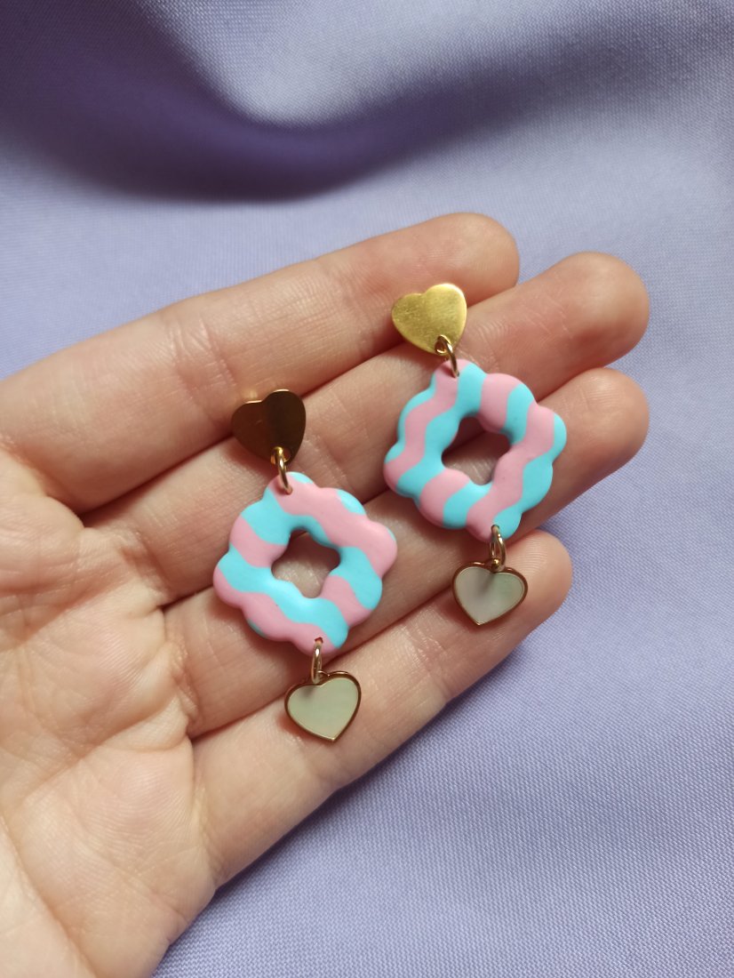 Kolczyki w kształcie nieregularnych kwadratów w kolorowe fale. Z serduszkiem z masy perłowej.