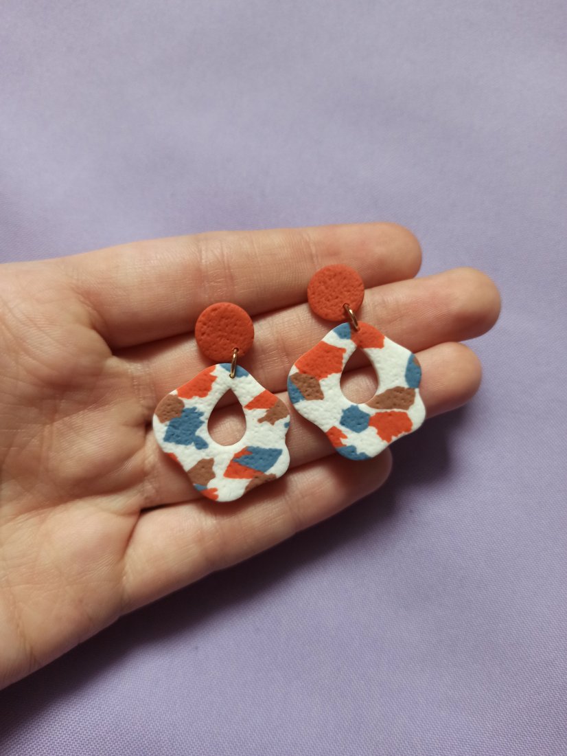 Kolczyki wiszące w organicznym kształcie w kolorowe ciapki.