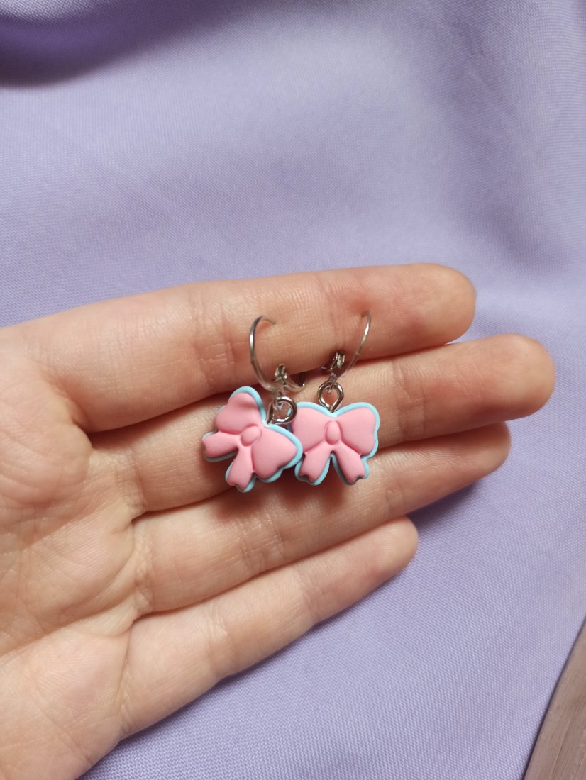 Kolczyki w kształcie różowych kokardek 3D z niebieską lamówką.