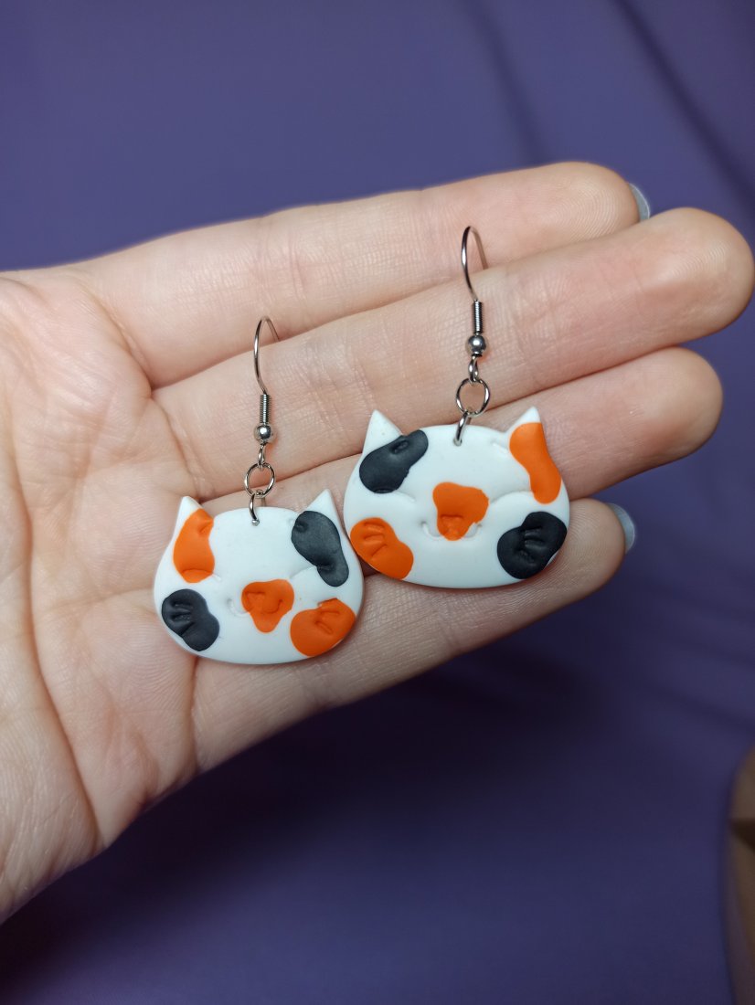 Kolczyki wiszące w kształcie dużych kocich głów. Kolorowe kotki.