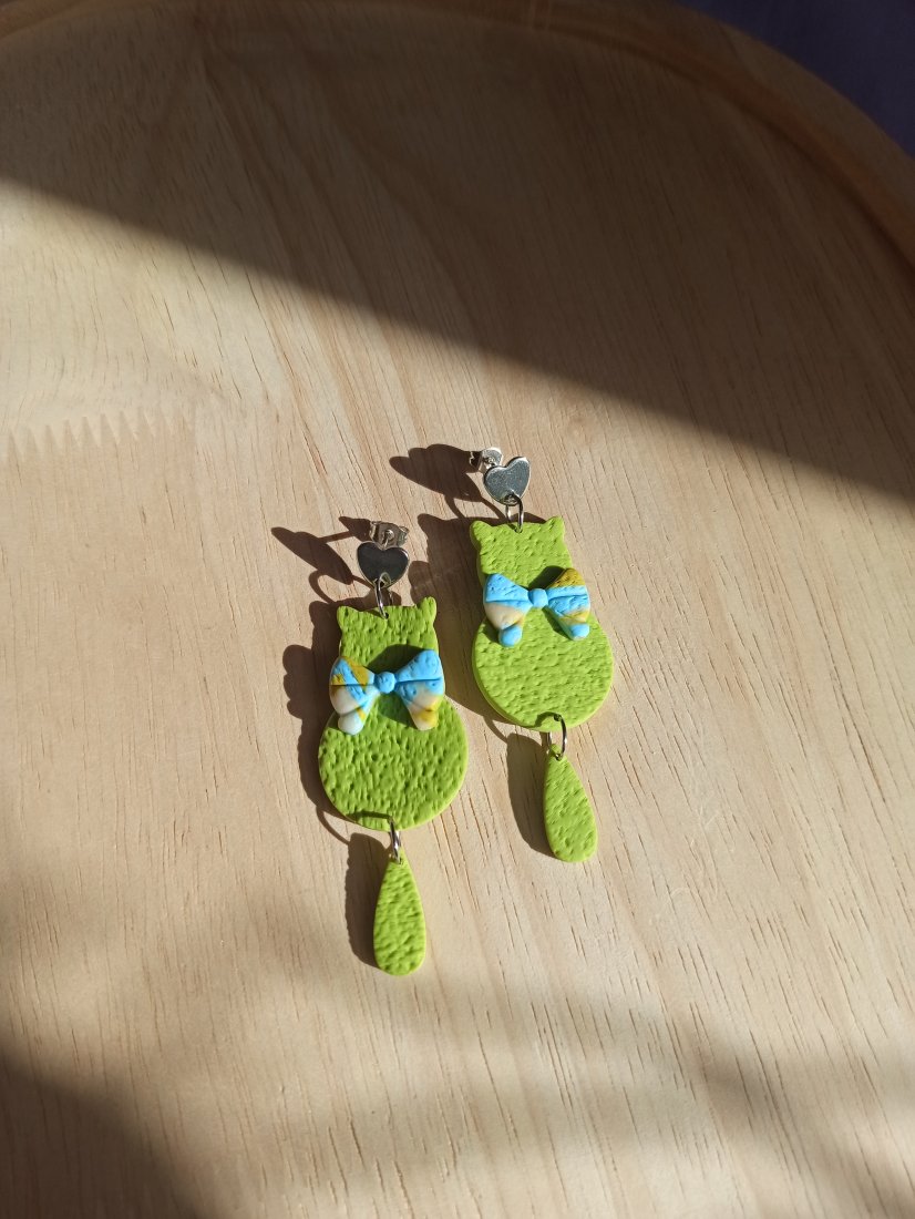 Kolczyki wiszące na ozdobnym sztyfcie serduszku w kształcie zielonych kotów z kolorową kokardką.