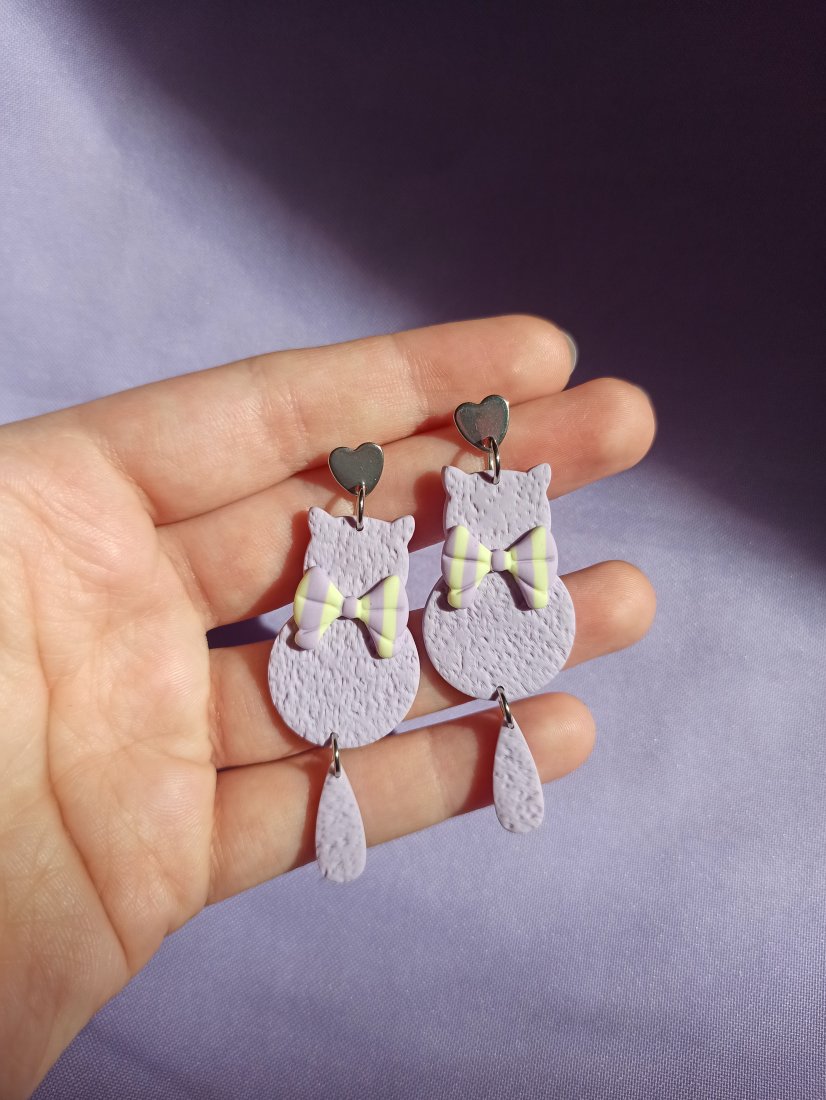 Kolczyki wiszące na ozdobnym sztyfcie serduszku w kształcie fioletowych kotów z pastelową kokardką w fioletowo żółte paski.