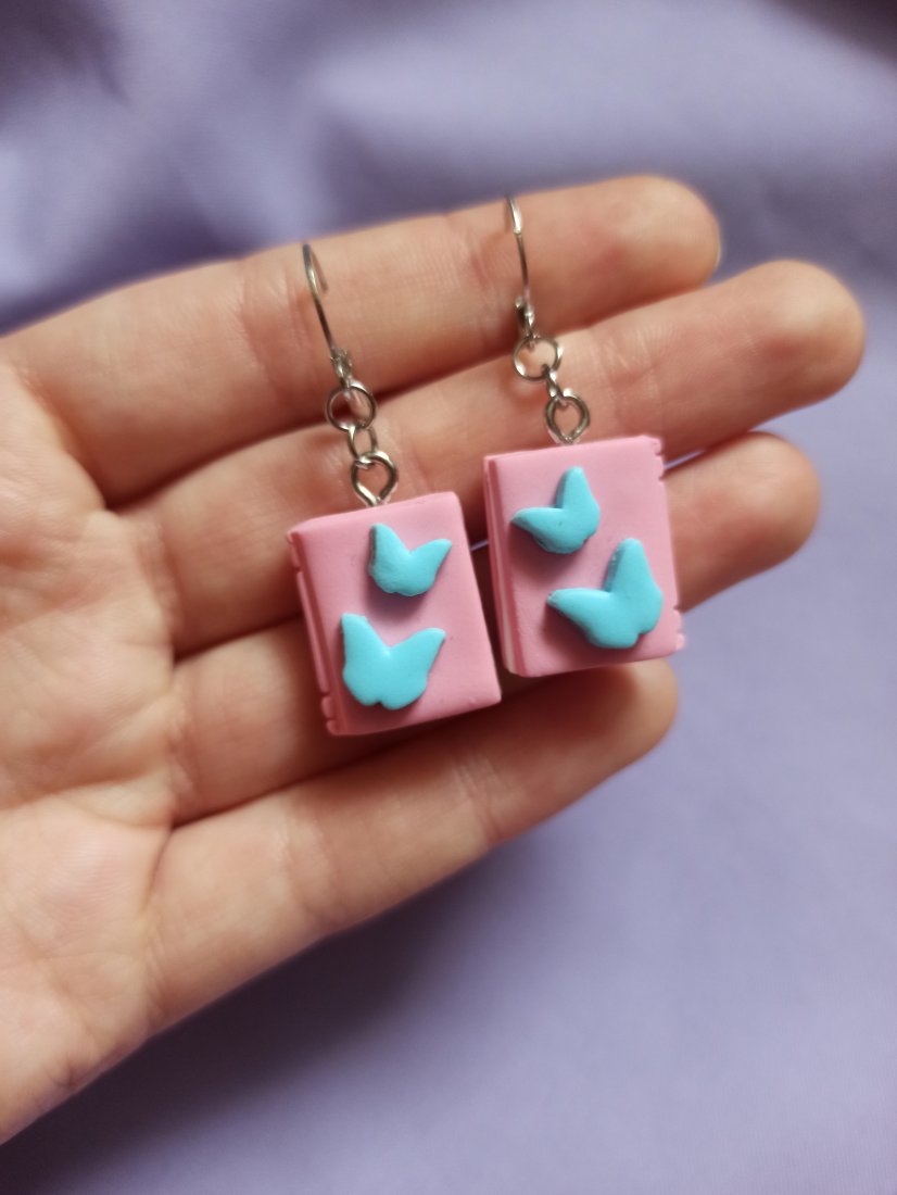 Kolczyki w kształcie różowych książek 3D z niebieskimi motylkami.