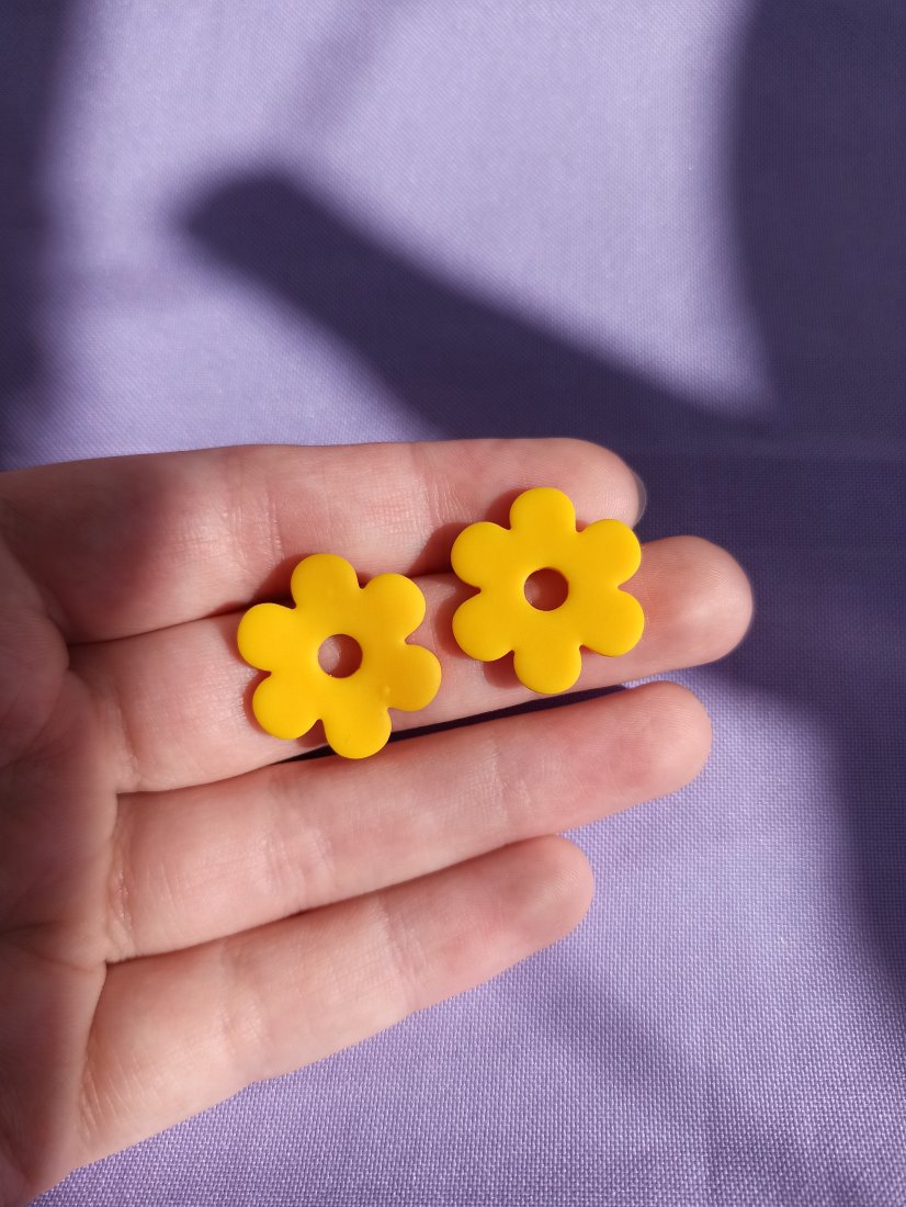 Kolczyki sztyfty w kształcie dużych kwiatków w kolorze żółtym.