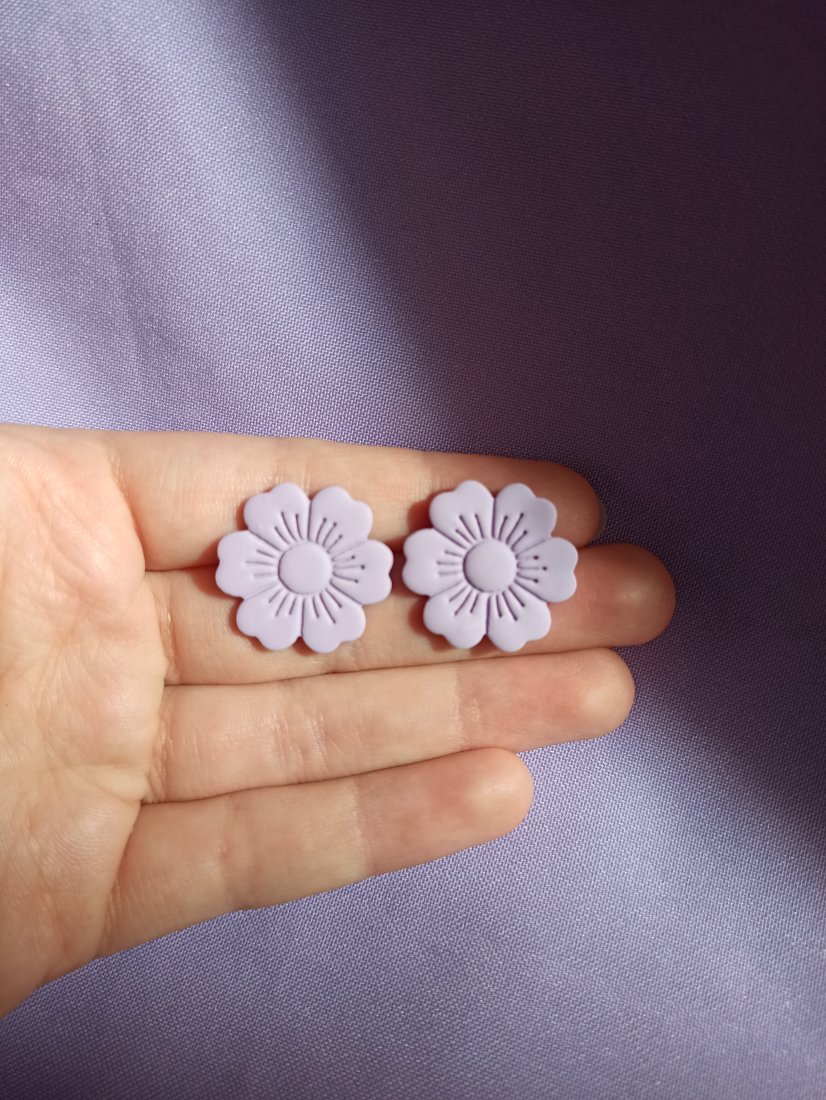 Kolczyki sztyfty w kształcie dużych kwiatków z widocznymi liniami płatków w kolorze pastelowo fioletowym.