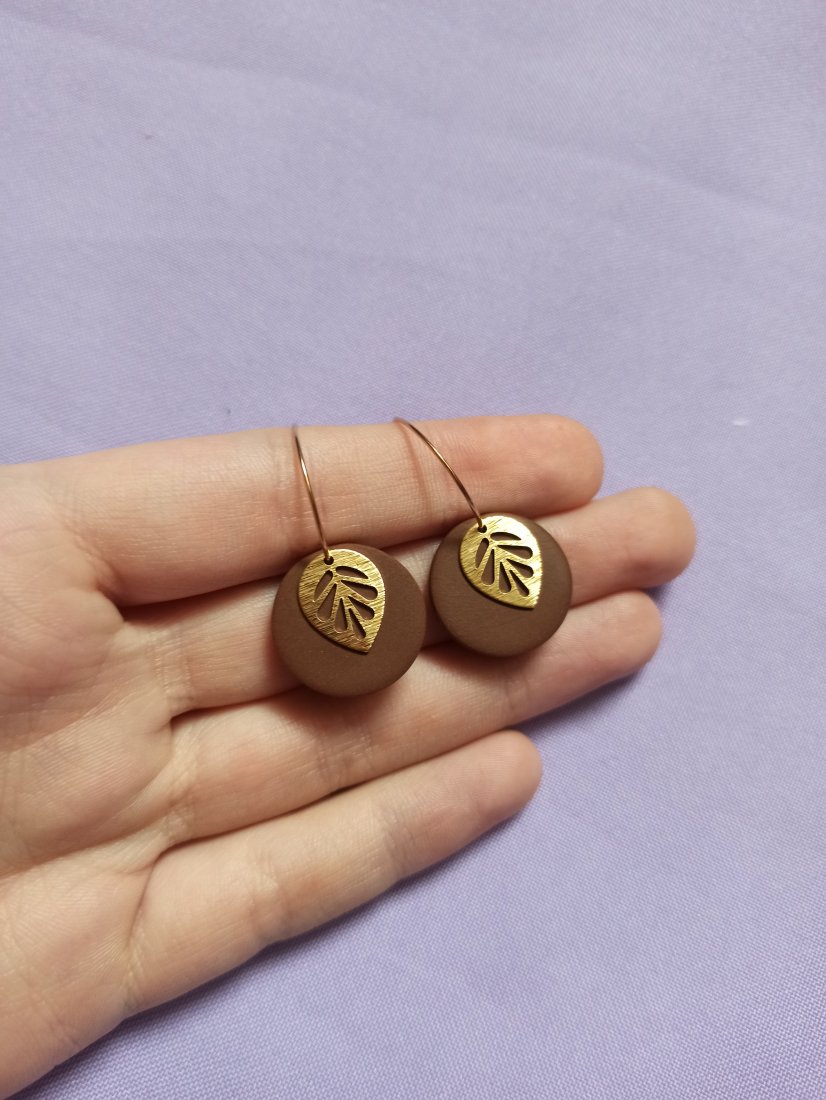 Gliniane kółka w kolorze brązowym z zawieszką ze stali chirurgicznej w kształcie listka.