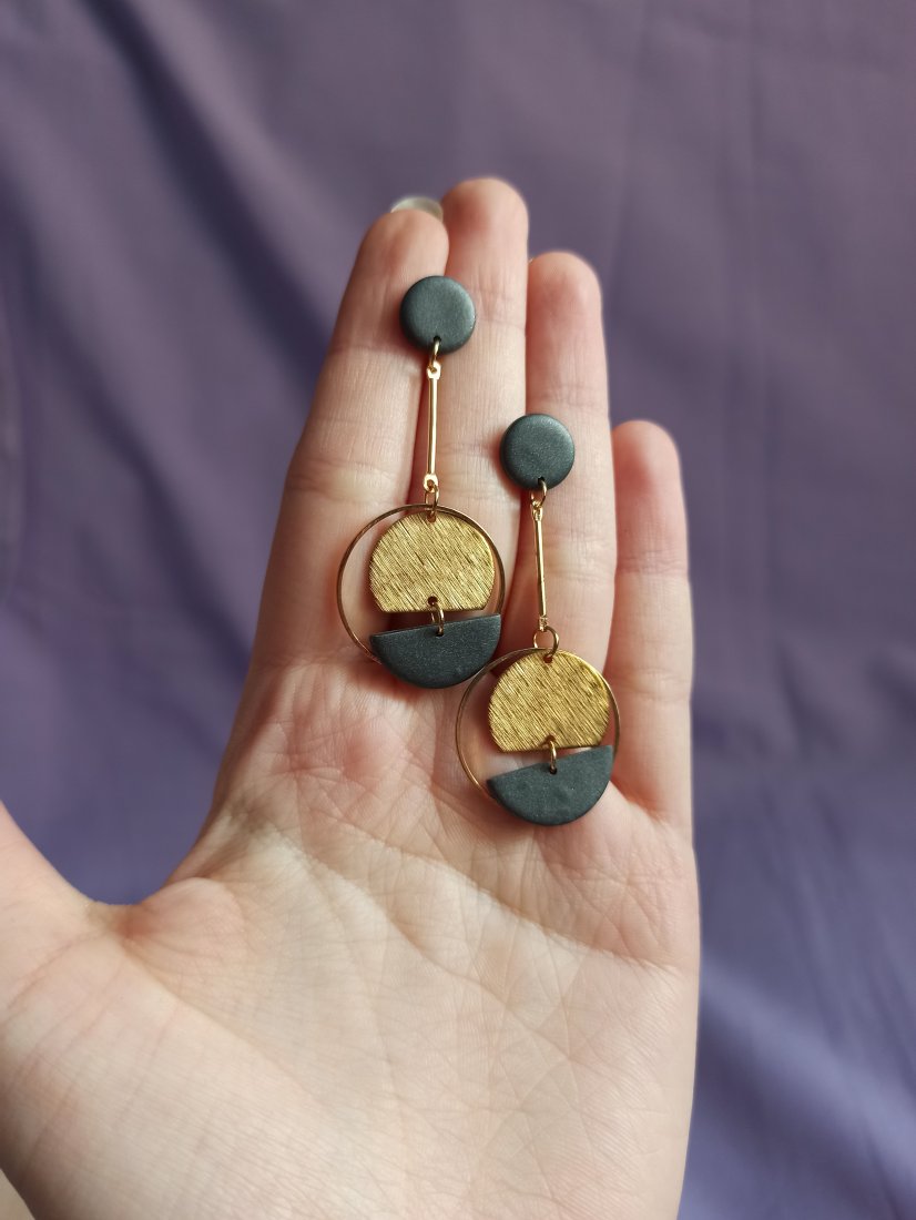 Eleganckie kolczyki szary metallic z elementami ze stali szlachetnej w kolorze złotym.