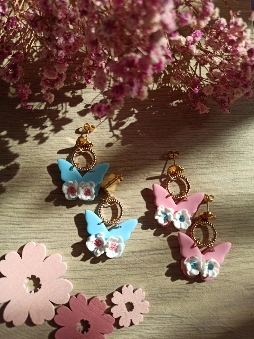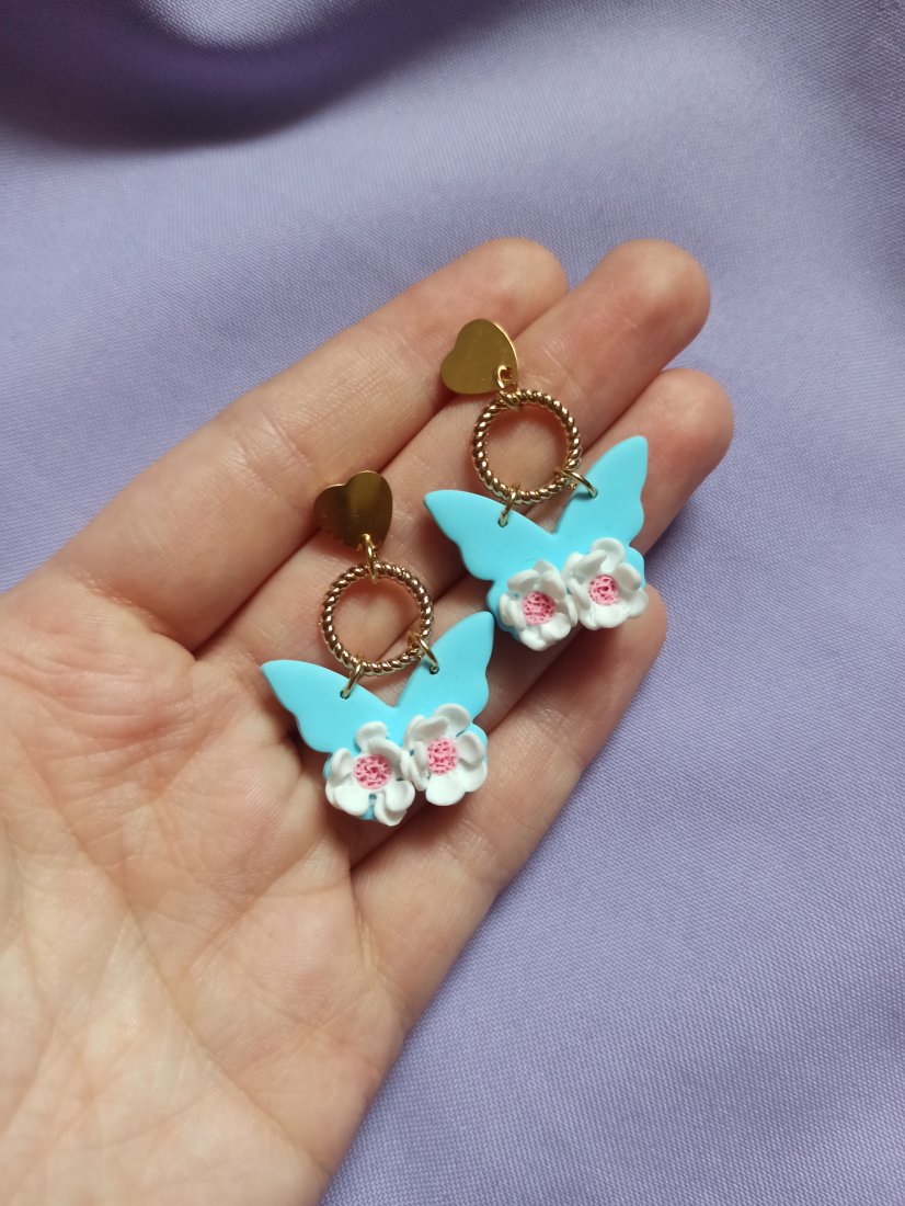 Kolczyki w kształcie niebieskich motylków z białymi kwiatkami