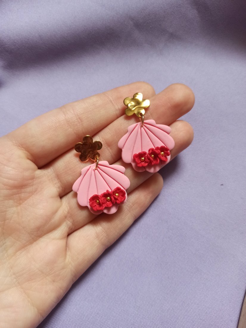 Kolczyki w kształcie różowych muszelek z czerwonymi kwiatkami na ozdobnym złotym sztyfcie w kształcie kwiatka.