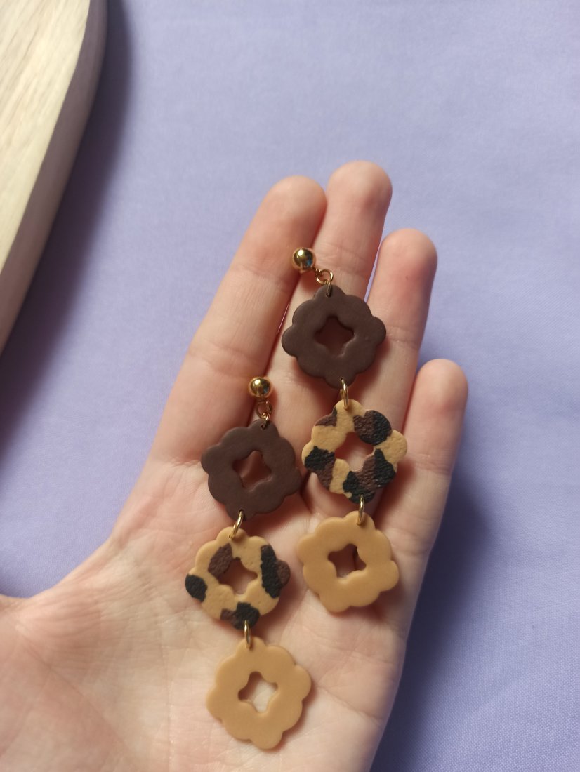 Kolczyki wiszące sztyfty trzy ozdobne kwadraciki. Brązowy w panterkę i beżowy