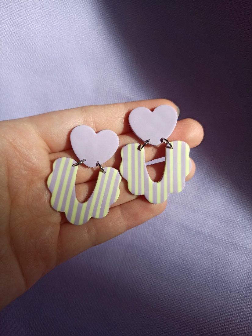 Kolczyki wiszące sztyfty fioletowe serca połączone z łukiem w żółto fioletowe paski. Wszystko w pastelowych odcieniach.