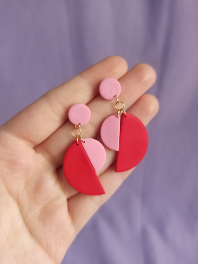 Kolczyki wiszące sztyfty w kształcie półkoli o różnych rozmiarach. Duże czerwone i małe różowe półkola.