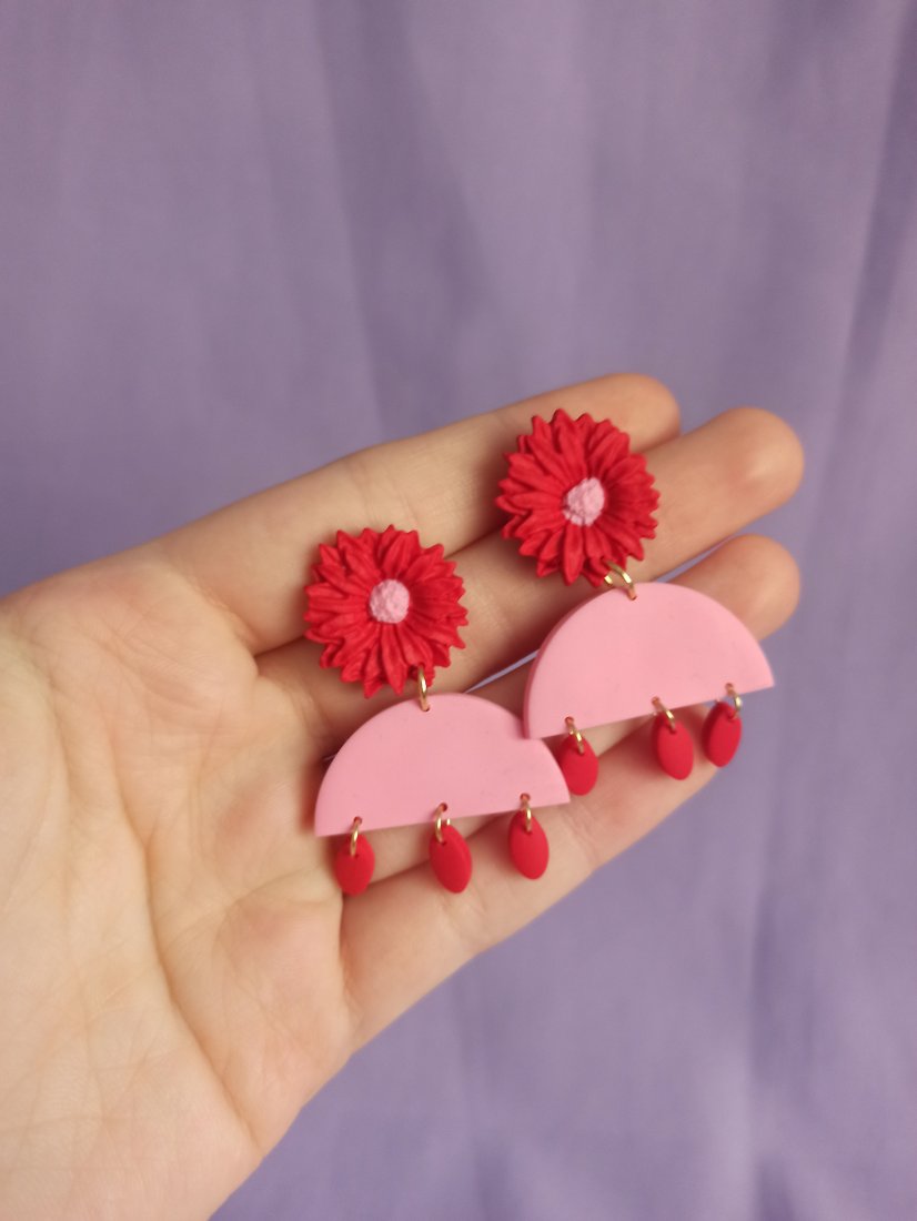Kolczyki wiszące sztyfty czerwone kwiatki z różowymi półkolami z czerwonymi zwisającymi pastylkami.