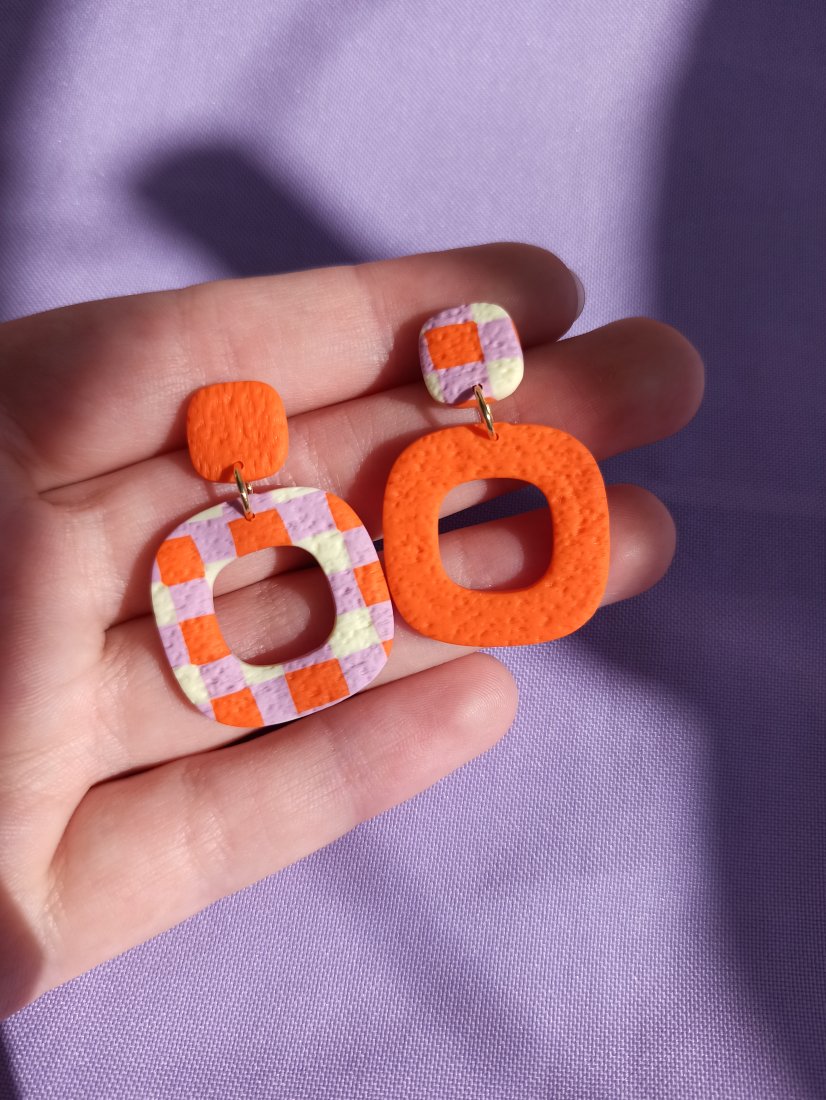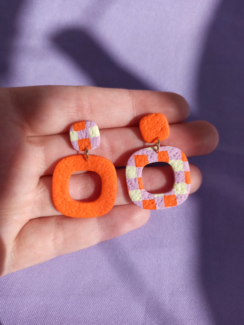 Kolczyki wiszące asymetryczne kwadraty pomarańczowe i w pomarańczowo różowo żółtą kratkę