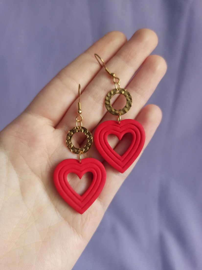 Kolczyki wiszące w kształcie czerwonych serc z okrągłą młotkowaną złotą zawieszką.