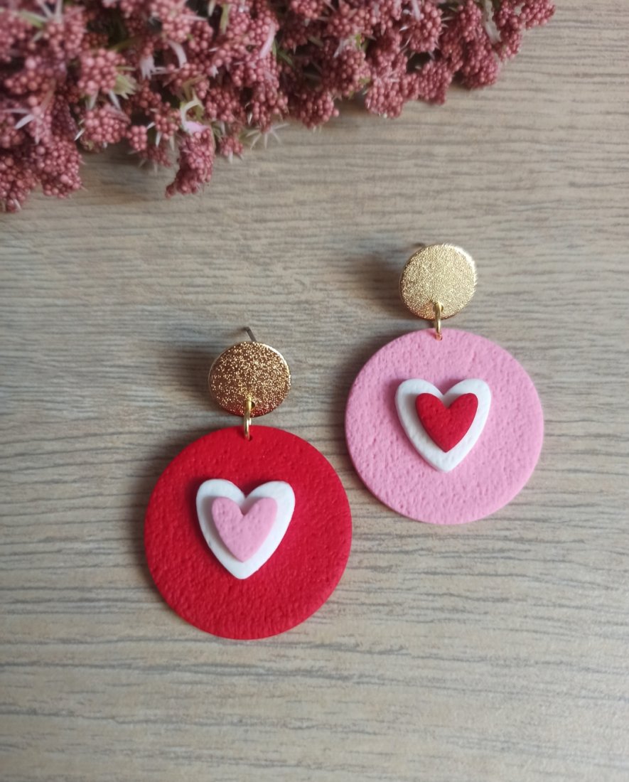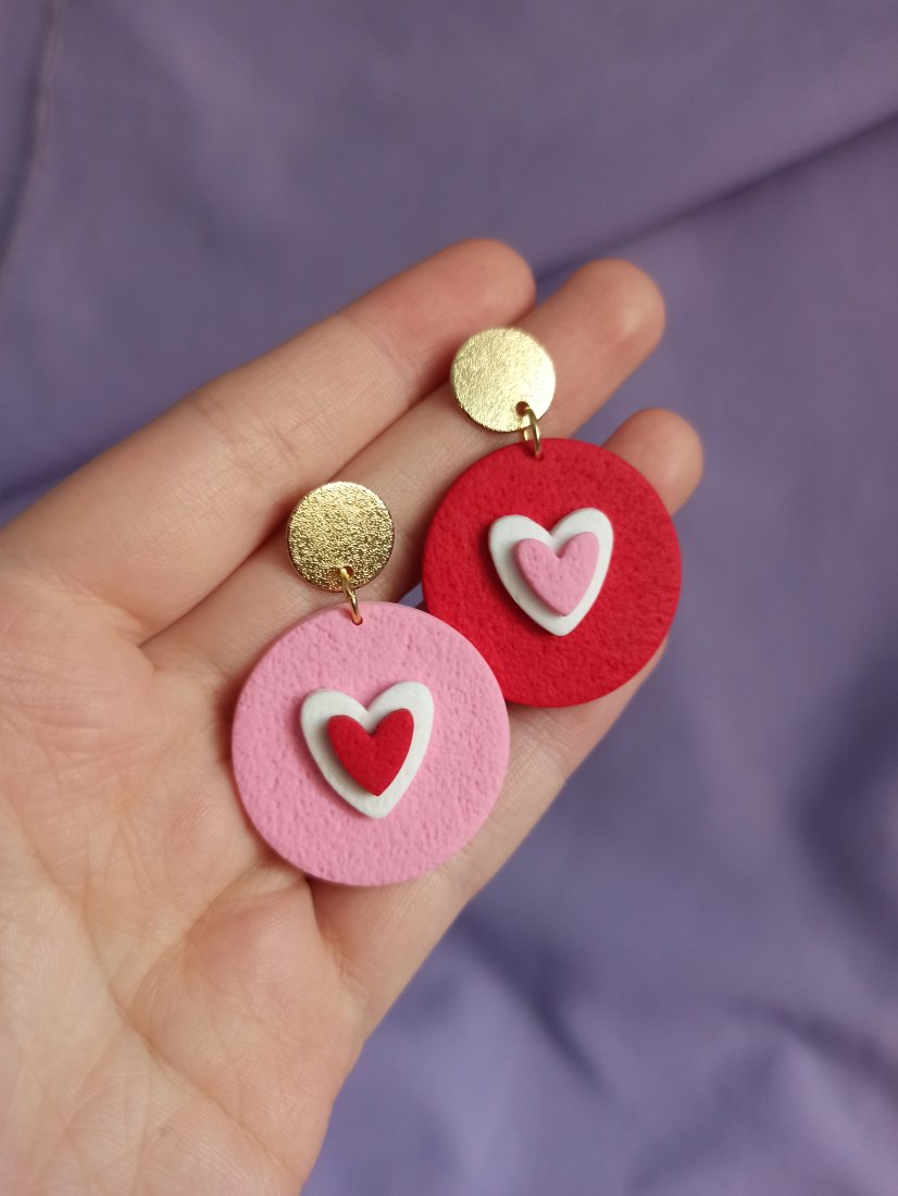 Kolczyki wiszące na ozdobnym sztyfcie w kształcie dużych kółek z serduszkami w środku. Efekt 3D .