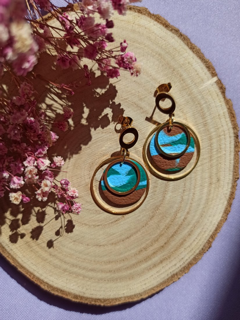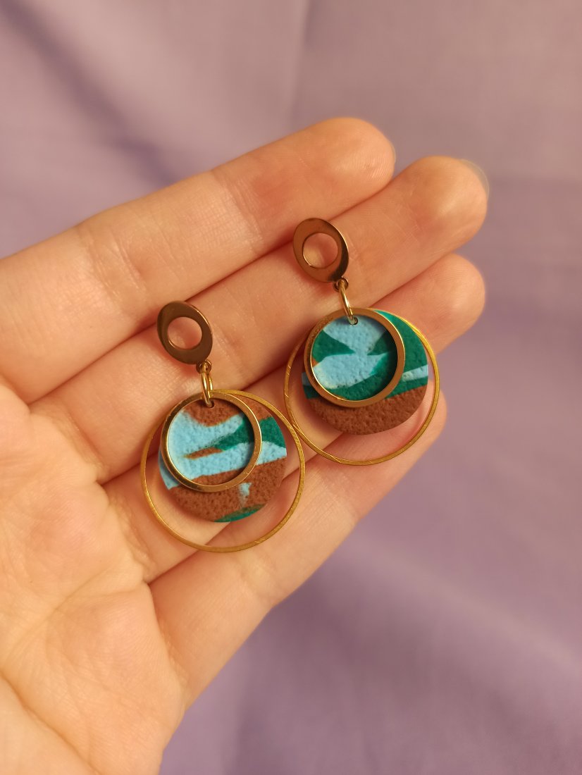 Kolczyki wiszące kółka z ozdobnymi złotymi kołkami. Kolczyki w marmurkowy wzór w kolorach szmaragdowej zieleni, błękitu i ciepłego brązu.