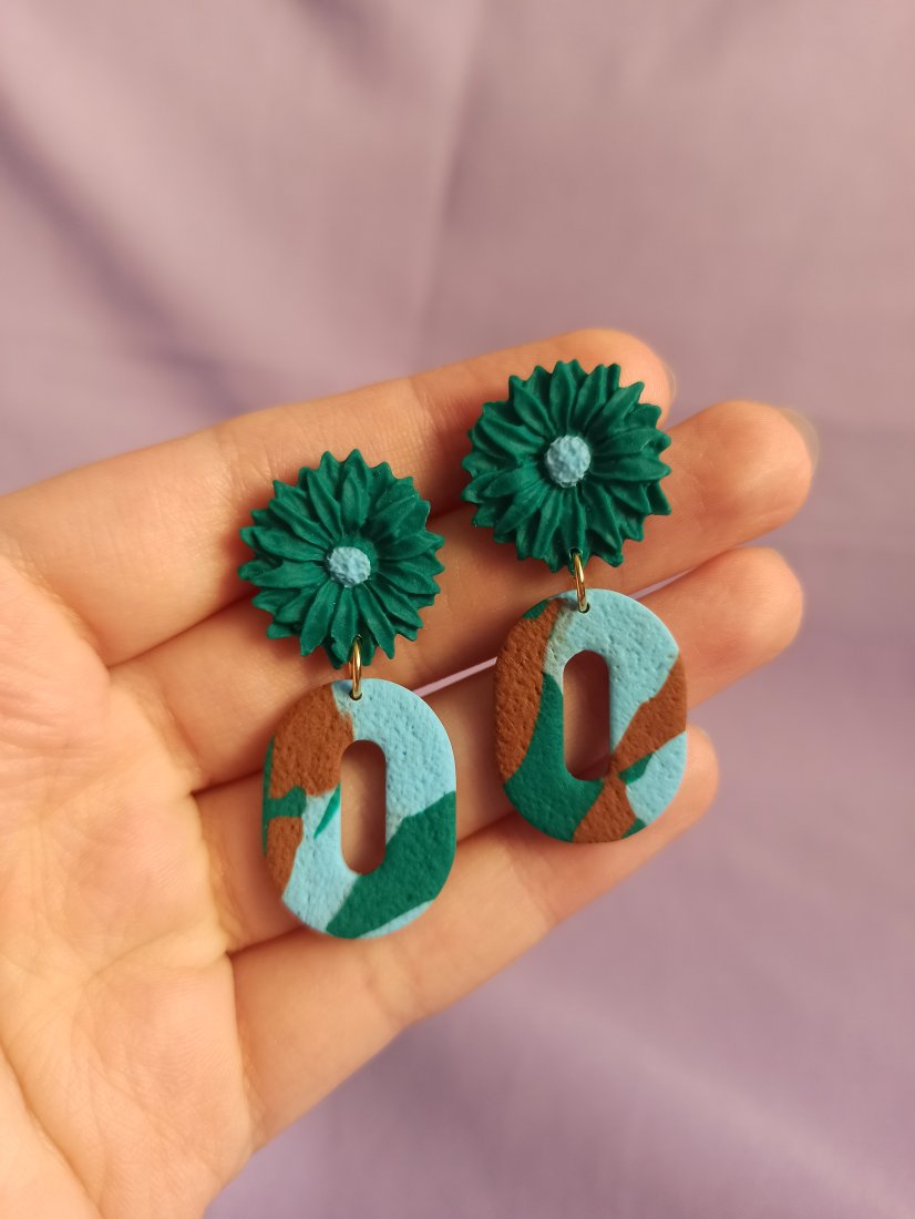 Kolczyki sztyfty szmaragdowe kwiaty i owale w marmurkowy wzór w kolorach szmaragdowej zieleni, błękitu i ciepłego brązu.
